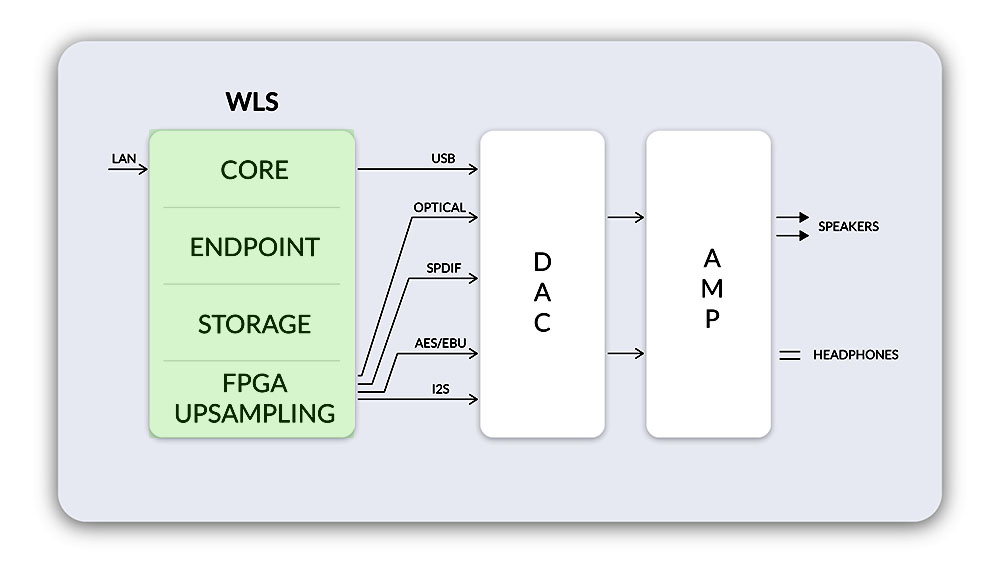 ยิ่งไปกว่านั้น พวกเขา (วิศวกรที่ออกแบบ WLS ตัวนี้) ยังได้ติดตั้งซอฟท์แวร์ที่ทำหน้าที่ในการ Upsampling และแปลงสัญญาณ PCM > DSD ลงไปอยู่ในนั้นด้วย รวมถึงยังทำให้ WLS มีคุณสมบัติเป็น Network Bridge ที่สามารถแปลงสัญญาณที่เข้ามาทาง Ethernet ให้ออกมาเป็นสัญญาณดิจิตัลเอ๊าต์พุตมาตรฐาน SPDIF เพื่อส่งออกไปทางขั้วต่อ Coaxial, Toslink และ AES/EBU และยังสามารถส่งสัญญาณดิจิตัลออกมาทางช่อง USB ได้ด้วย (*เอ๊าต์พุต I2S, Coaxial, Toslink และ AES/EBU จะได้ประโยชน์จากการทำงานของฟังท์ชั่น Upsampling / PCM>DSD Transcoding ในขณะที่เอ๊าต์พุต USB จะส่งออกสัญญาณเป็นแบบ native โดยไม่ได้รับผลจากการทำงานของฟังท์ชั่น Upsampling / PCM>DSD Transcoding นี้)