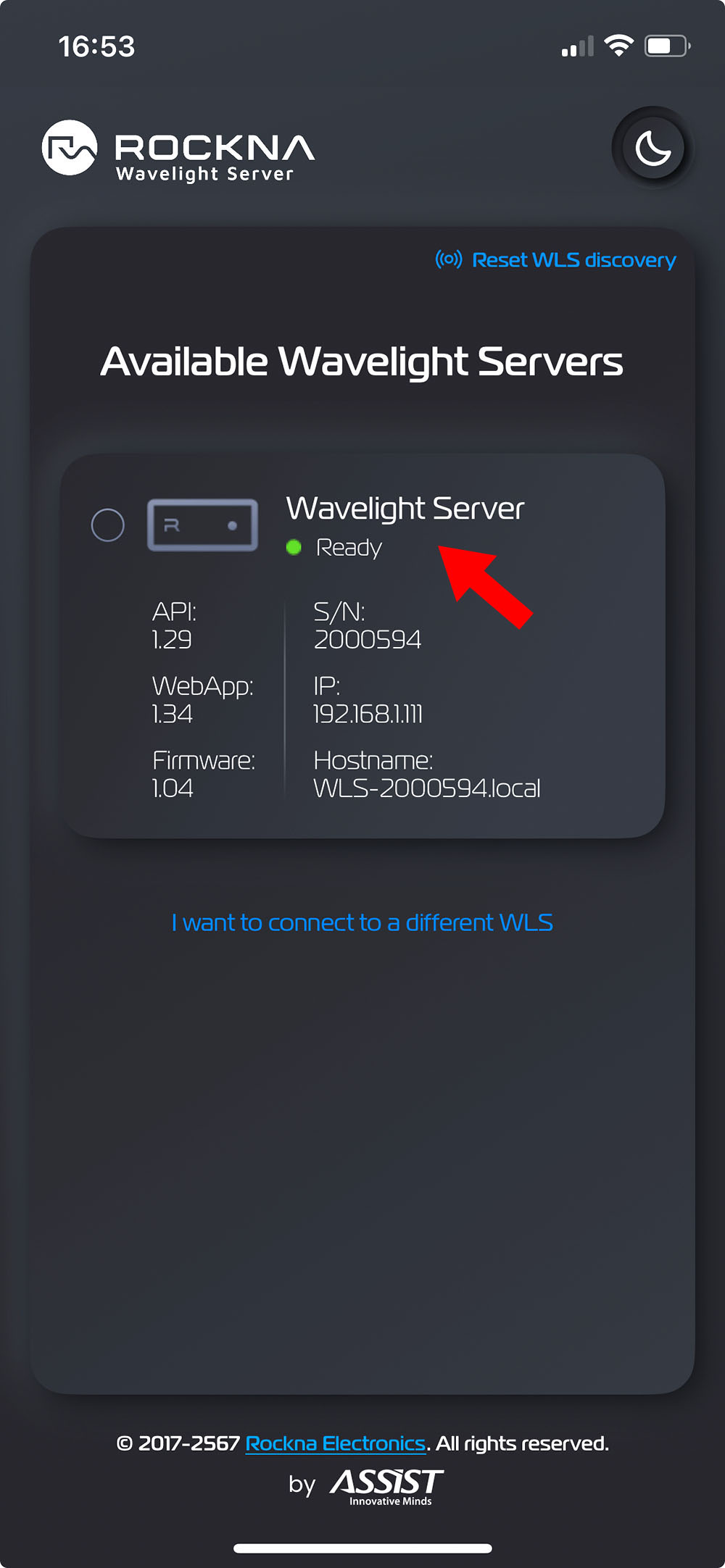 การเข้าไปรับตั้งค่าและควบคุมการทำงานของตัว WLS ตัวนี้จะต้องกระทำผ่านทางแอพลิเคชั่นอุปกรณ์พกพา หรือทาง web browser แค่สองทางนี้เท่านั้น ปรับตั้งที่ตัวเครื่องโดยตรงไม่ได้ เพราะบนตัวเครื่องไม่มีปุ่มควบคุมใดๆ ดังนั้น หลังแกะกล่องออกมาแล้ว ก่อนจะเริ่มต้นใช้งานคุณจึงต้องดาวน์โหลดแอพฯ มาติดตั้งบนอุปกรณ์พกพาของคุณซะก่อน ซึ่งแอพฯ ที่ผู้ผลิตออกแบบมาให้ใช้ชื่อว่า ‘Wavelight Server’ มีครบทุกเวอร์ชั่นทั้ง Android, iOS และบนคอมพิวเตอร์ หลังจากโหลดแอพฯ มาติดตั้งเสร็จแล้ว เมื่อเปิดแอพฯ และเปิดเครื่องครั้งแรก หลังจากตัวเครื่องเชื่อมต่อกับเน็ทเวิร์คได้แล้ว เมื่อบนจอแอพฯ ปรากฏขึ้นมาตามภาพข้างบน ก็แสดงว่าตัว WLS ของคุณพร้อมสำหรับใช้งานแล้ว เมื่อจิ้มลงไปที่ชื่อตัวเครื่อง (ศรชี้) เป็นการเข้าไปในเมนูการปรับตั้งค่าของเครื่องซึ่งมีหัวข้อให้ปรับตั้งมากถึง 6 เมนู