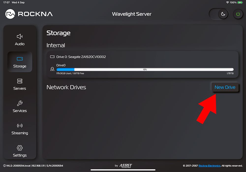 ในตัว WLS สามารถติดตั้งฮาร์ดดิส SSD ไว้สำหรับเก็บไฟล์เพลง ซึ่งรองรับความจุได้ตั้งแต่ 2TB ไปจนถึง 16TB ส่วนวิธี add ไฟล์เพลงเข้าไปในฮาร์ดดิสเหล่านี้สามารถทำได้ผ่านทางคอมพิวเตอร์ (ได้ทั้ง Mac และ PC) ที่เชื่อมต่ออยู่ในเน็ทเวิร์คเดียวกัน และในกรณีถ้าคุณมี NAS อยู่ในเน็ทเวิร์ควงเดียวกัน คุณก็สามารถเพิ่ม NAS เข้ามาใน Storage ได้ด้วยโดยคลิ๊กที่ปุ่ม ‘New Drive’ (ศรชี้) แล้วกรอกข้อมูลโลเคชั่นของ NAS เข้าไป นอกจากนั้น คุณยังสามารถเพิ่มไฟล์เพลงที่คุณเก็บไว้ในฮาร์ดดิส USB แบบพกพาของคุณเข้ามาเล่นผ่าน WLS ได้โดยเสียบเข้าที่ช่อง USB ที่อยู่บนแผงด้านหลังได้อีกด้วย