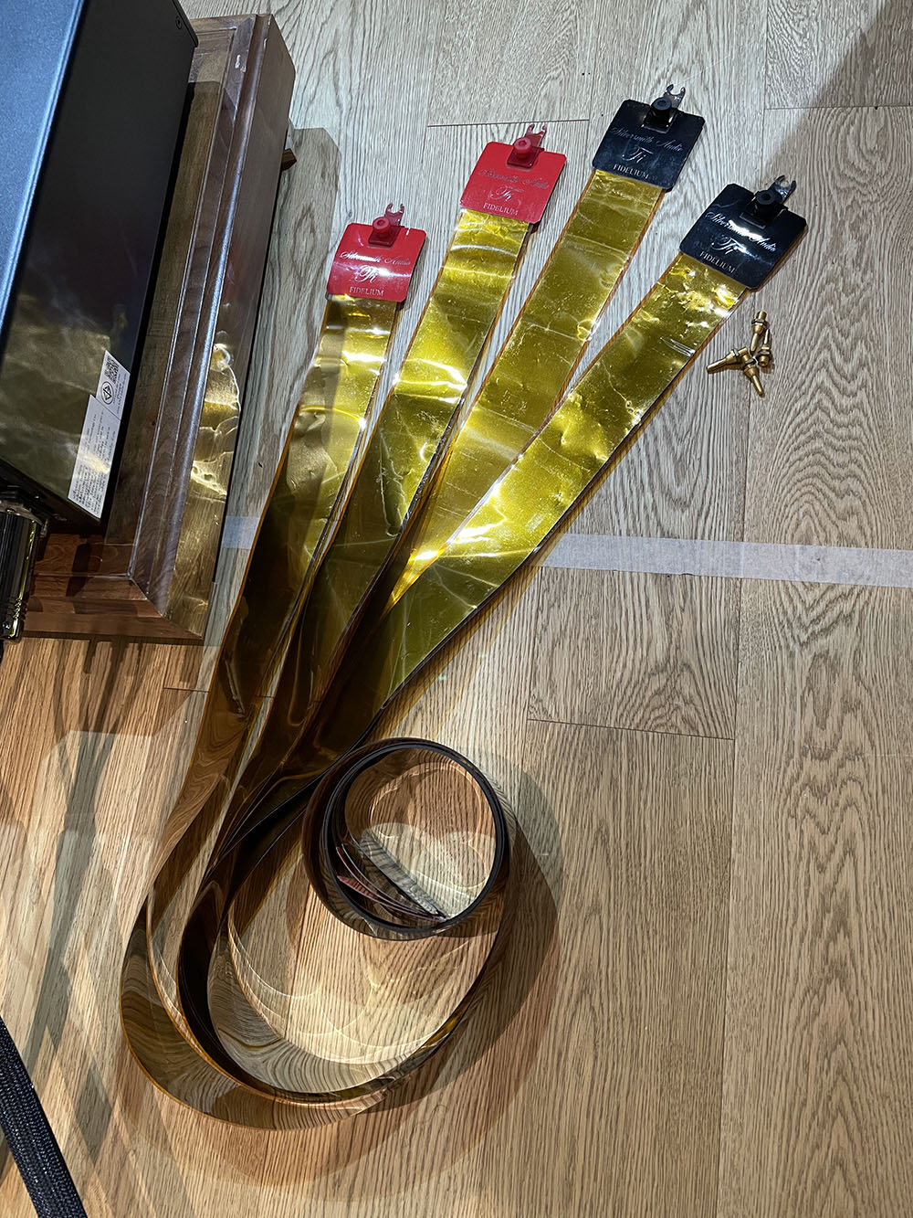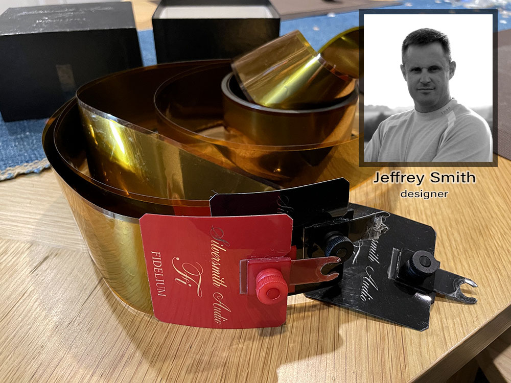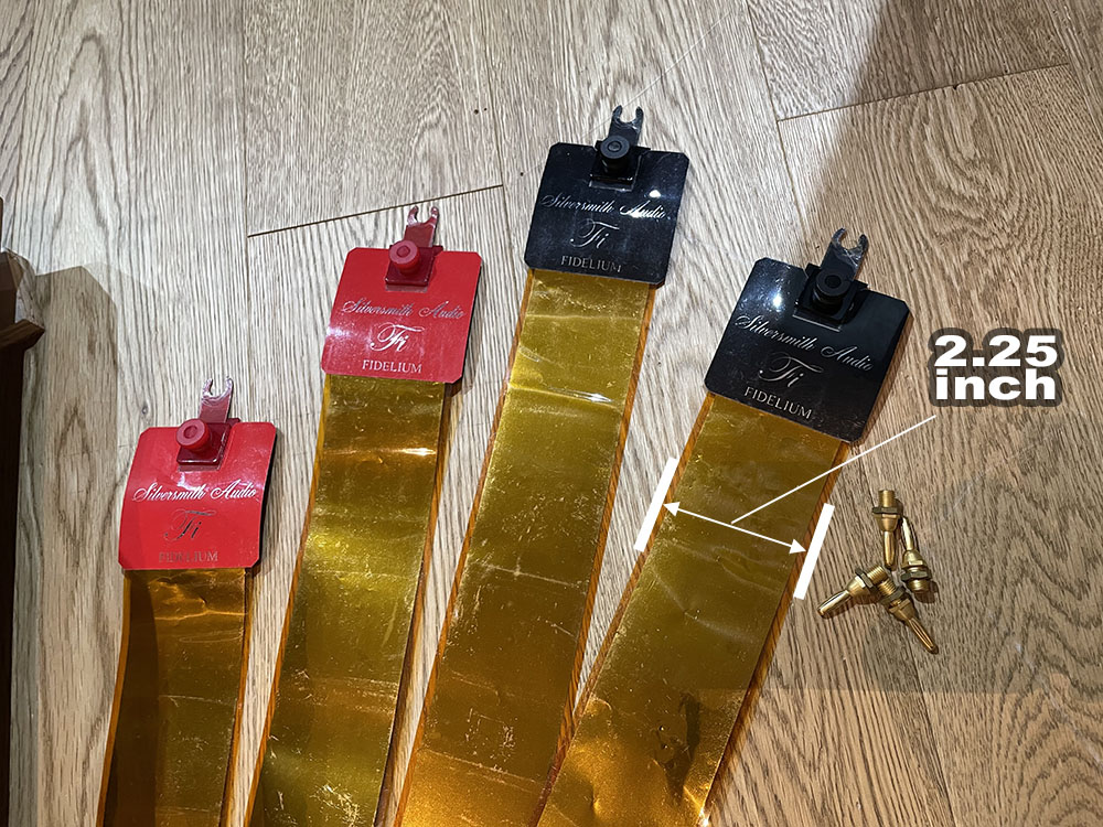 แต่สายลำโพงของแบรนด์ Silversmith Audio ตัวนี้เป็นอะไรที่แตกต่างไปจากทั้งสองแบรนด์ข้างต้น โดยพื้นฐานมันคือสายลำโพงที่ใช้ตัวนำโลหะผสม หรืออัลลอยด์ที่มีชื่อเรียกว่า Palladium โดยรีดออกมาเป็นแผ่นแบนๆ และบางมาก คือมีความหนาไม่ถึง 1/1000 ของนิ้ว แต่มีความกว้างมากถึง 2.25 นิ้ว จึงสมควรจะเรียกว่า แผ่นมากกว่าที่จะเรียกว่าเป็น เส้น