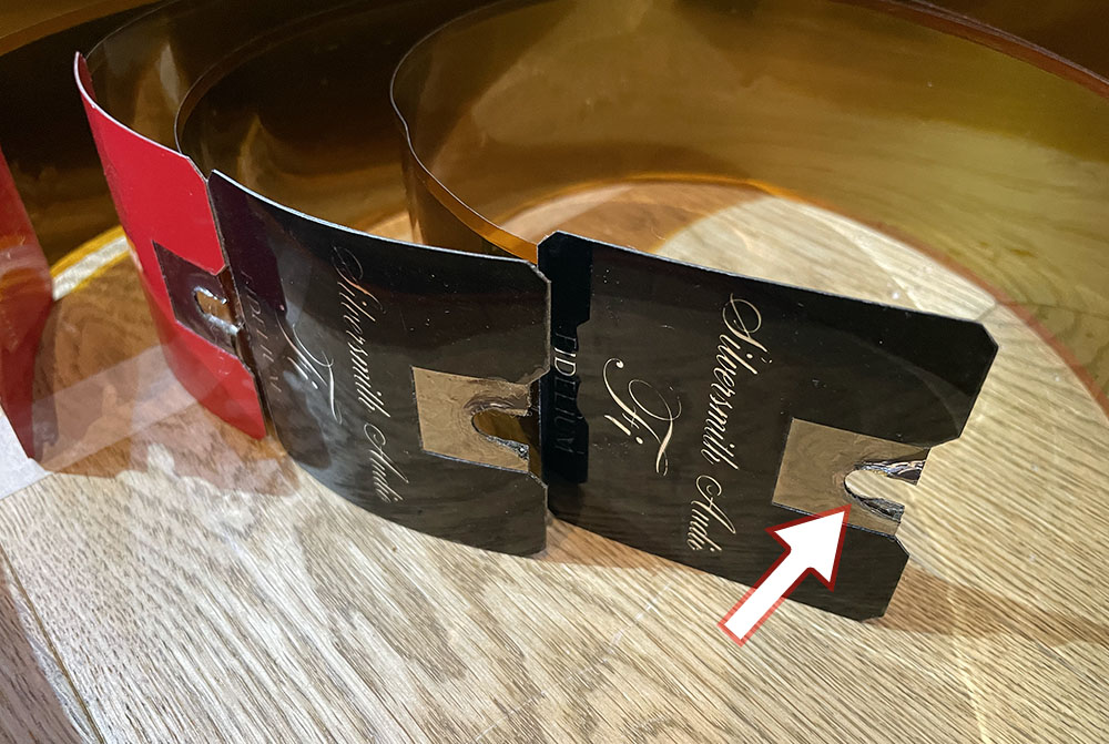 นั่นคือเหตุผลที่ทำให้สายลำโพงของ Silversmith Audio ตัวนี้ ไม่มีขั้วต่อ!ที่ส่วนปลายของแผ่นตัวนำถูกบากเป็นช่องเว้าประมาณเกือบ 1 .. เพื่อให้สามารถเสียบเข้าไปที่แกนของขั้วต่อสายลำโพงแล้วหมุนล็อคไว้ได้ ส่วนของแผ่นตัวนำที่ต้องสัมผัสกับตัวขันยึดของขั้วต่อสายลำโพงมีฟอยด์สีเงินบางๆ กั้นอยู่ นัยว่าเพื่อทำให้การจับยึดของขั้วต่อสายลำโพงที่แน่นหนึบมากขึ้น และคงมีส่วนช่วยลดความสึกหรอของแผ่นตัวนำของสายลำโพงตัวนี้ไปด้วยในตัว