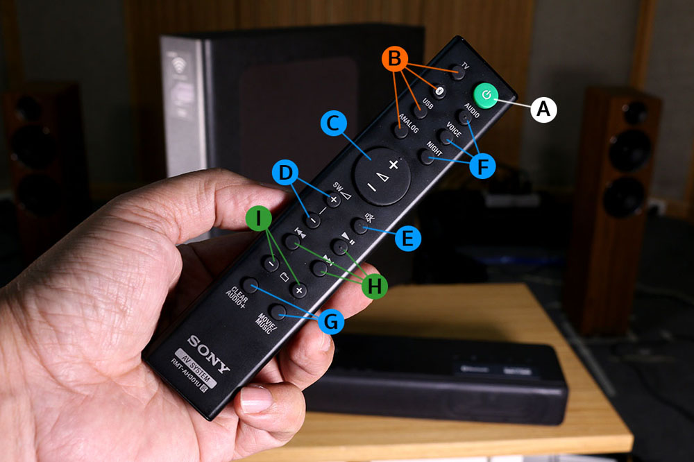 A : ใช้ปุ่มนี้เพื่อเปิดลำโพงซับวูฟเฟอร์ หรือปรับเข้าโหมดสแตนด์บายโดยมีไฟ LED ดวงเล็กๆ ด้านล่างคอยแสดงสถานะให้ทราบ