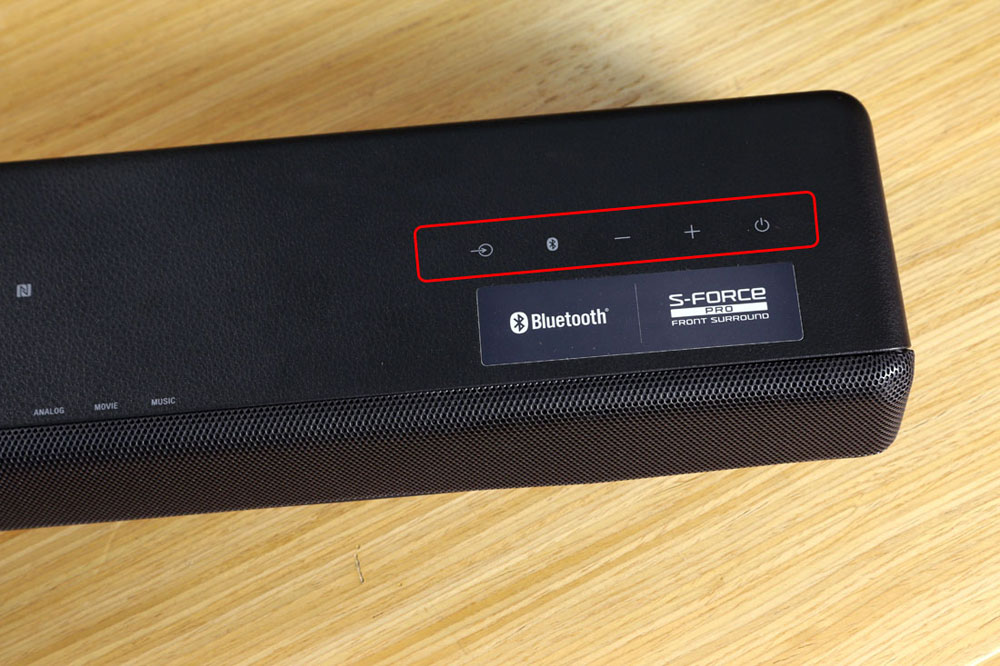 เหล่านี้เป็นปุ่มสัมผัสที่ใช้งานได้เหมือนการกดบนรีโมทฯ แต่มีให้ใช้จำกัดแค่ (ซ้ายไปขวา) เลือกอินพุต, เชื่อมต่อ Bluetooth, ปรับลด–เพิ่มความดัง, เปิด–ปิดเครื่อง