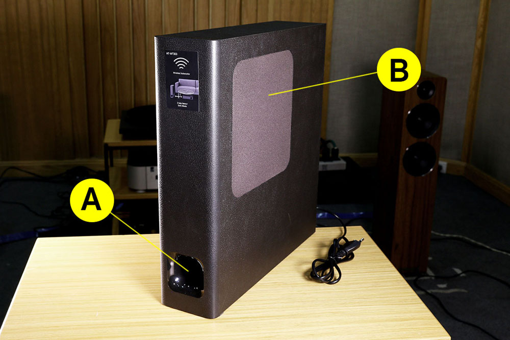 B : จุดติดตั้งลำโพง เวลาวางใต้โซฟา ต้องแหงนด้านนี้ขึ้นข้างบน
