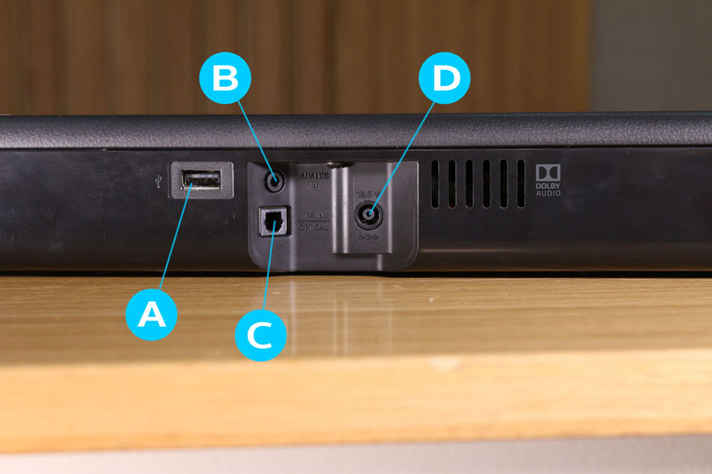 D : ปุ่มปรับเพิ่ม–ลดเสียงของลำโพงซับวูฟเฟอร์