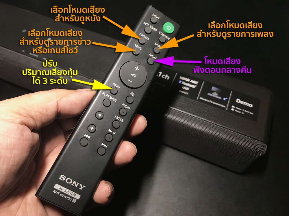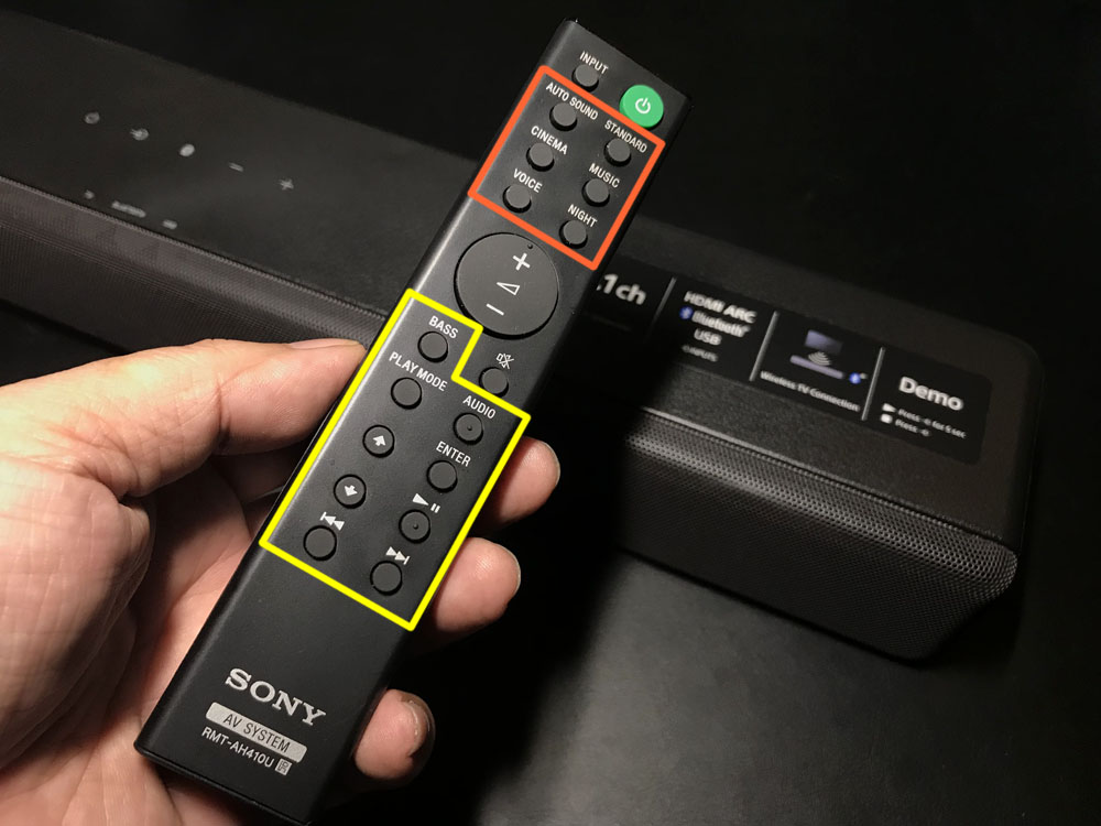 อีกวิธีที่สะดวกกว่าคือควบคุมด้วยรีโมทไร้สายที่แถมมาให้ รุ่น RMT-AH410U ขนาดกระทัดรัดเหมาะมือ มีหน้าที่หลักๆ อยู่ครบ ไม่ว่าจะเป็น เปิด/ปิดเครื่อง, เลือกอินพุต, ปรับวอลลุ่ม, สั่งหยุดเสียงชั่วคราว รวมทั้งชุดคำสั่งสำหรับควบคุมการเล่นไฟล์เพลงจากแฟรชไดร้ที่เสียบเข้าที่ช่อง USB-A (กรอบสีเหลือง) และชุดคำสั่งที่ใช้กดเลือกระบบเสียงสำเร็จรูป (กรอบสีส้ม)