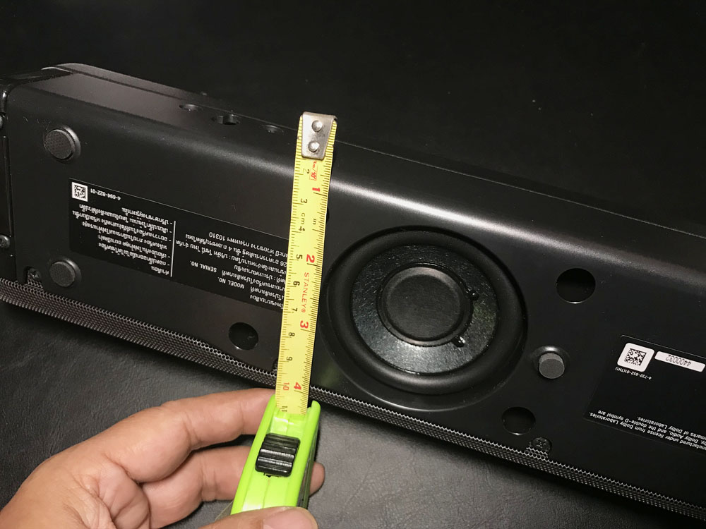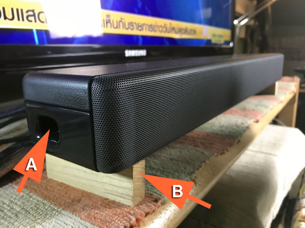 เนื่องจากตัวไดเวอร์ซับวูฟเฟอร์ถูกติดตั้งให้ยิงคลื่นความถี่ลงพื้นด้านล่าง ดังนั้น ลักษณะของพื้นผิวที่ใช้วางลำโพงซาวน์บาร์จะมีผลต่อเสียงของความถี่ต่ำที่ได้ออกมามากเป็นพิเศษ ถ้าเสียงทุ้มที่ได้มีลักษณะห้วน กระชับ และเก็บตัวมากเกินไป แนะนำให้ลองหาอะไรมาหนุนด้านล่างของตัวซาวนด์บาร์ให้ยกลอยจากพื้นโต๊ะที่ใช้วางขึ้นมาสักนิด ในภาพ (B) ผมใช้แท่งไม้เล็กๆ รองหนุนด้านล่าง สูงจากพื้นโต๊ะขึ้นมาประมาณสองถึงสามเซนติเมตร เพื่อเปิดโอกาสให้ความถี่ต่ำมีระยะในการสะท้อนกับพื้นมากขึ้น จะทำให้ความถี่ต่ำมีลักษณะที่ผ่อนตัวมากขึ้น และมีปริมาณมากขึ้น ทำให้ได้ความแน่นของเสียงมากขึ้น