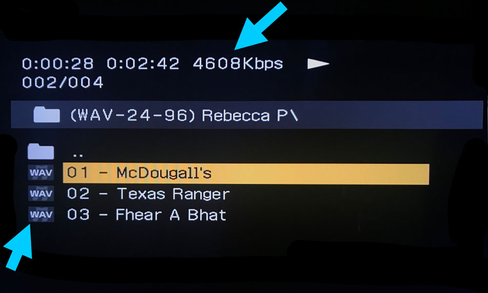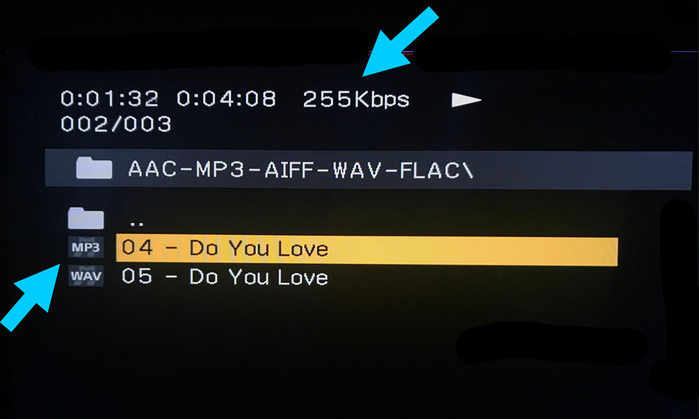 ปรากฏว่า S200F ไม่รองรับการเล่นไฟล์ FLAC, AAC และ AIFF คือถ้าเป็นไฟล์ที่ S200F ไม่รองรับ มันจะไม่แสดงไฟล์นั้นขึ้นมาบนเมนูเลย จากภาพนี้ ซึ่งในโฟลเดอร์ที่ผมทดลองใส่ลงไปในแฟรชไดร้มีไฟล์อยู่ทั้งหมด 5 ประเภท คือ AAC, MP3, AIFF, WAV และ FLAC ปรากฏว่าพอเลือก ENTER ลงไปที่โฟลเดอร์นี้ ปรากฏว่า บนจอมีแต่ไฟล์ MP3 กับไฟล์ WAV โชว์ออกมาให้เลือกเล่นแค่ 2 ไฟล์เท่านั้น และเมื่อผมกดเลือกเล่นที่แทรค 4 ซึ่งเป็นเพลงเดียวกับแทรค 5 แต่ผมเข้ารหัส (encode) มาเป็นไฟล์ MP3 ตอนเล่น บนหน้าจอจะแสดงอัตรา bitrate ของสัญญาณที่กำลังเล่นขึ้นมาให้ดูด้วย ในภาพศรชี้สีฟ้าด้านบนนั้นคืออัตราบิตเรตของสัญญาณ MP3 ของไฟล์ที่กำลังเล่นนี้ (255Kbps)