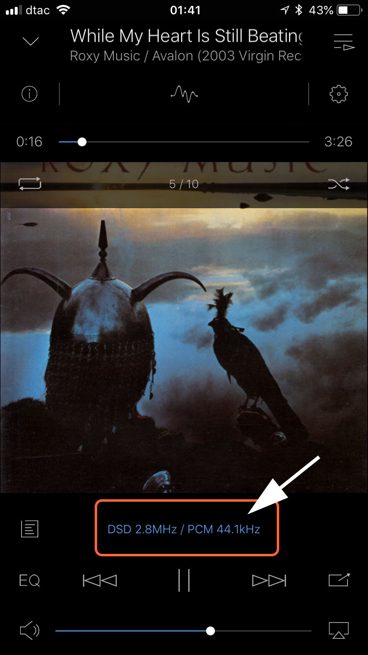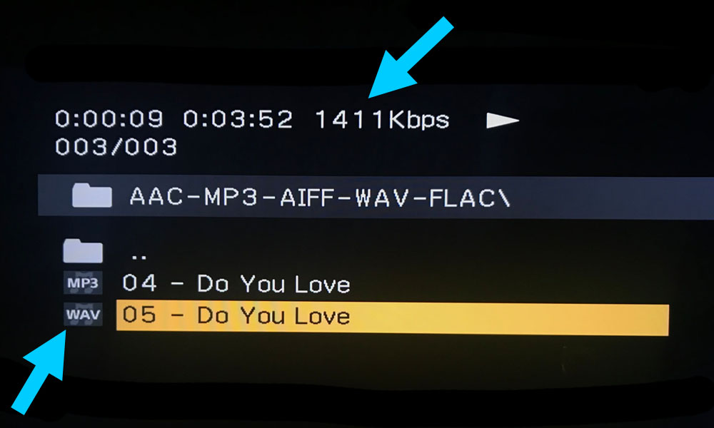 เมื่อผมลองเปลี่ยนมาเล่นไฟล์ WAV แทรคที่ 5 ปรากฏว่าเล่นได้ และบนหน้าจอก็แสดงอัตาบิตเรตของสัญญาณขึ้นมาซึ่งตรงกับมาตรฐานของสัญญาณ PCM 2 Ch ของซีดีคือ 16 x 44,100 x 2 = 1411Kbps (จำนวนเต็มคือ 1,411,200 bps)