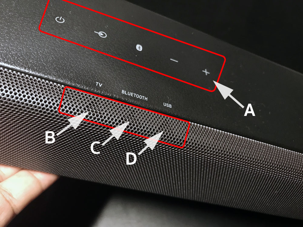 คุณสามารถควบคุมสั่งงานการทำงานของ S200F ได้ 2 ทาง ทางเลือกแรกคือ ใช้นิ้วจิ้มลงไปบนสัญลักษณ์ที่พิมพ์อยู่บนหลังตัวซาวนด์บาร์ โดยใช้วิธีสัมผัสด้วยแรงกดเบาๆ ซึ่งมีแยกการสั่งงานไว้ 4 ฟังท์ชั่น (ลูกศร A) คือ เปิด/ปิดเครื่อง, เลือกอินพุต, เชื่อมต่อ Bluetooth และ ปรับเพิ่ม/ลดวอลลุ่ม นอกจากนั้น ใกล้ๆ กันจะมีไฟอยู่ 3 ดวง ใช้แสดงสถานะการทำงานของ “อินพุต” ที่คุณเลือกใช้ติดตั้งอยู่ใต้ตะแกรงตาข่าย ดวงแรก (B) จะสว่างขึ้นเป็นสีขาว กรณีที่คุณเลือกอินพุตทีวี เพื่อรับฟังเสียงจากทีวี ดวงถัดมา (C) เป็นไฟแสดงสถานะการทำงานของอินพุต Bluetooth ซึ่งจะสว่างขึ้นเป็นสีฟ้า จะกระพริบเพื่อแสดงว่าพร้อมสำหรับการเชื่อมต่อ เมื่อคุณทำการเชื่อมต่อ Bluetooth กับอุปกรณ์ของคุณเสร็จแล้ว ไฟดวงนี้จะหยุดกระพริบ และถัดไป (D) เป็นไฟสีขาวซึ่งจะสว่างขึ้นเมื่อคุณเลือกใช้อินพุต USB