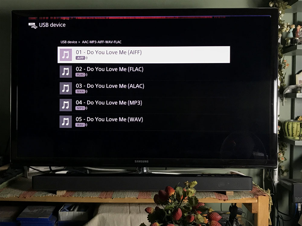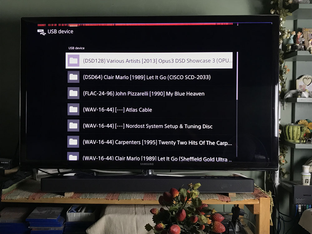 ผมลองฟังไฟล์เพลงหลายๆ ฟอร์แม็ตกับ HT-X9000F โดยเลือกใช้ช่องอินพุต USB แล้วใช้รีโมทไร้สายในการควบคุมสั่งงาน ในภาพข้างบน เมื่อเสียบ USB เข้าไปแล้วกดเลือกอินพุตไปที่ USB เครื่องจะอ่านข้อมูลโฟลเดอร์ของอัลบั้มเพลงที่ผมใส่ไว้ในแฟรชไดร้ออกมาโชว์ตามภาพ