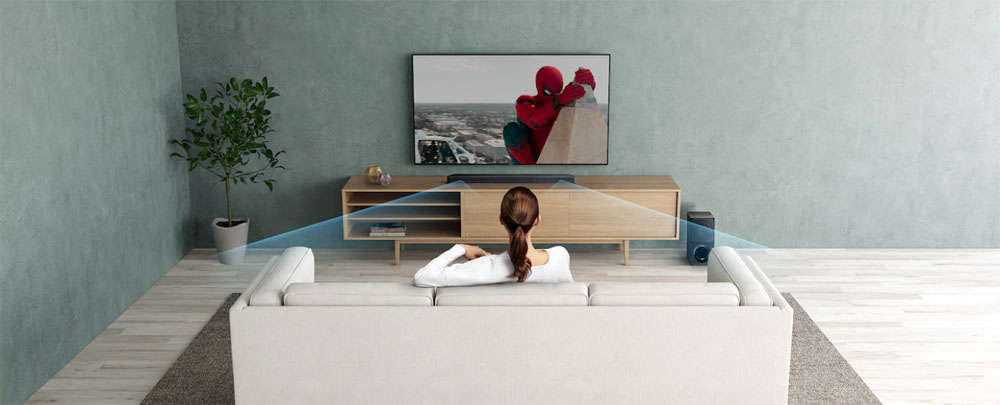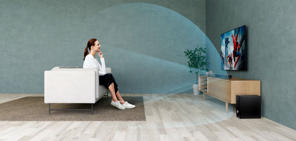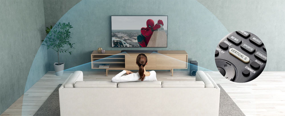 ส่วนระบบเสียงก็สามารถรองรับได้สูงสุดไปถึงระบบเสียง Immersive Surround Sound ที่มีสนามเสียงในแนวตั้ง ซึ่งกำลังนิยมกัน นั่นคือฟอร์แม็ต Dolby Atmos และ DTS:X ที่ให้สนามเสียง 7.1.2 ch โอบล้อมทั้งในแนวระนาบซ้าย–ขวา, หน้า–หลัง รวมถึงแนวตั้งคือบน–ล่าง ให้ผ่านออกมาทางลำโพงซาวนด์บาร์กับลำโพงซับวูฟเฟอร์แค่สองตัว โดยอาศัยการทำงานของ DSP ที่มาพร้อมเทคโนโลยีพิเศษที่ชื่อว่า Vertical Surround Engine เพื่อทำให้ทุกระบบเสียงที่คุณรับชมถูก scale ขึ้นไปเทียบเท่ากับระบบเสียง Dolby Atmos 7.1.2 ch ที่มีสนามเสียงโอบล้อมครบทั้ง 360 องศา