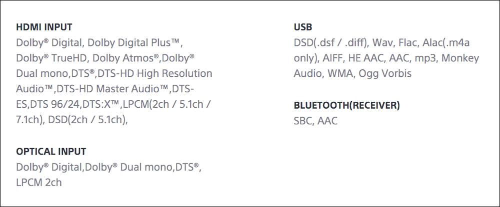 น่าทึ่งสำหรับคนที่ชอบฟังเพลงที่เน้นคุณภาพเสียงเป็นพิเศษอย่างผม เมื่อพบว่า ลำโพงซาวนด์บาร์ HT-X9000F ชุดนี้รองรับการเล่นไฟล์เพลง DSF และ DIFF ได้ รวมถึงฟอร์แม็ต Lossless ที่เน้นคุณภาพอื่นๆ ด้วย อาทิ AIFF, ALAC, WAV และ FLAC