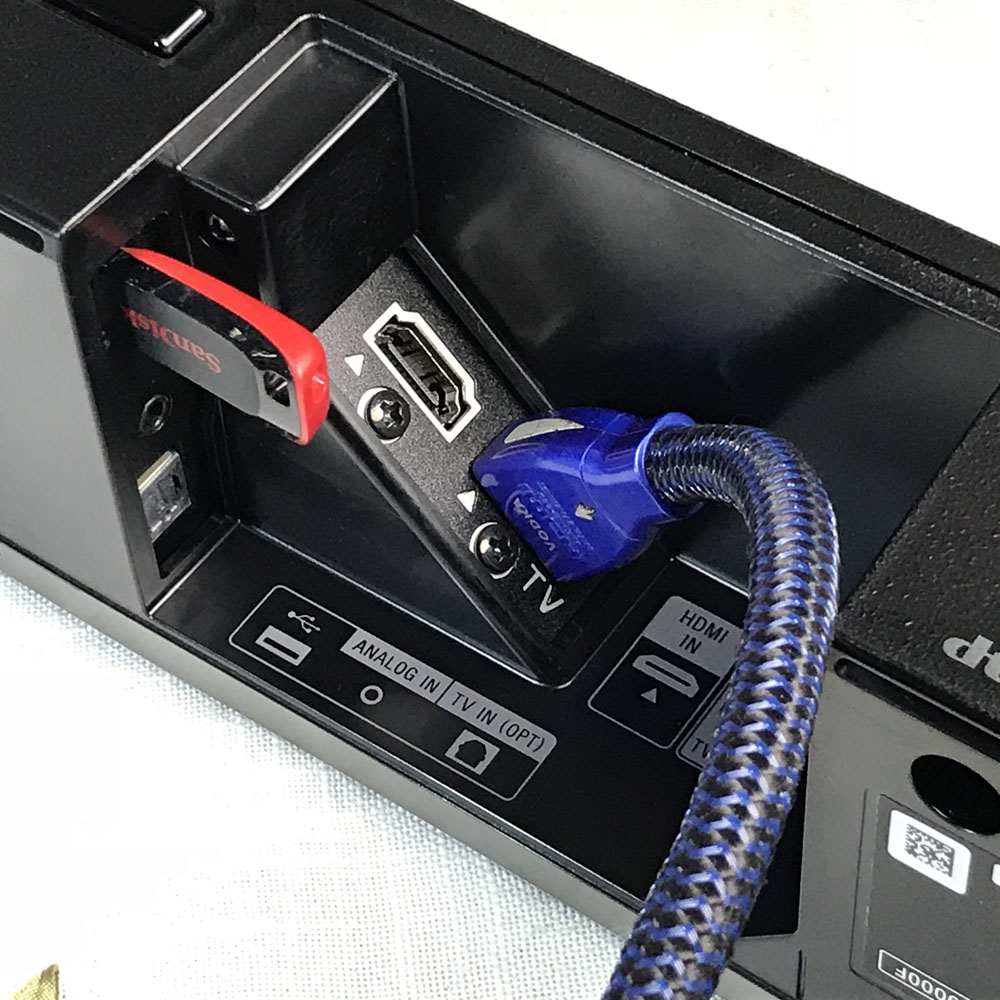 ช่องทางหลักที่ใช้เชื่อมต่อสัญญาณระหว่างทีวีกับตัวซาวนด์บาร์คือช่อง HDMI (ARC) ซึ่งโซนี่พิมพ์กำกับไว้ว่า TV เพื่อให้ผู้ใช้เข้าใจง่ายๆ ว่าให้ใช้ช่องอินพุตนี้ในการเชื่อมต่อตัวซาวนด์บาร์ SA-X9000F เข้ากับทีวี เพียงแต่ว่า ตอนเสียบสาย HDMI เข้าที่ทีวี ให้เลือกช่อง HDMI ที่รองรับ ARC (Audio Return Channel) ด้วยเพื่อให้สัญญาณเสียงจากทีวีวิ่งไปที่ตัวซาวนด์บาร์ทางช่อง HDMI ช่องเดียวกันนี้ แต่ถ้าทีวีของคุณไม่มีช่อง HDMI (ARC) ให้เสียบช่อง HDMI ธรรมดาได้ แต่คุณต้องหาสาย Optical มาเชื่อมต่อสัญญาณเสียงจากทีวีเข้ากับช่อง Optical input ของตัวซาวนด์บาร์ SA-X9000F ด้วย มิฉนั้น คุณจะไม่สามารถดึงเสียงจากทีวีมาขยายผ่านตัวซาวนด์บาร์ได้