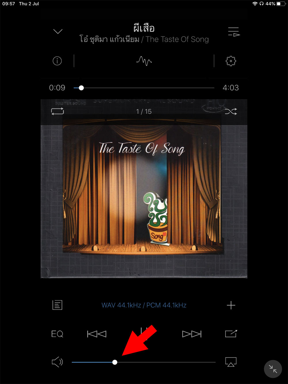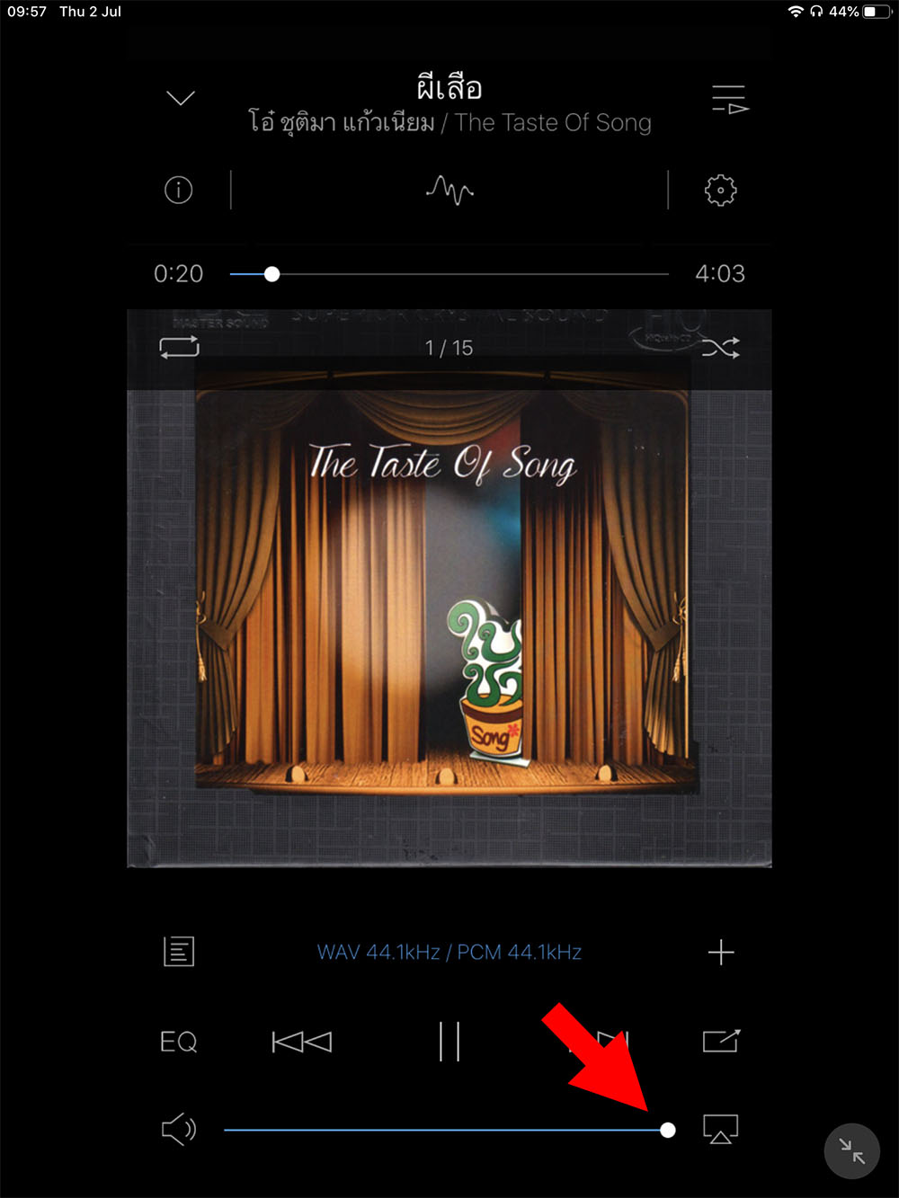 จากนั้นผมก็ทดลองเล่นเพลงด้วยแอพฯ Onkyo HF Player ส่งสัญญาณไปที่ 1250 เสียงก็ไปปกติ แต่ทุกครั้งที่เริ่มต้นเชื่อมต่อและเล่นไฟล์เพลง ผมพบว่า วอลลุ่มที่ตัวแอพฯ Onkyo HF Player จะเริ่มต้นอยู่ที่ระดับประมาณ 30% (ศรชี้รูปบน) ซึ่งคุณอาจจะพบว่าเร่งวอลลุ่มที่ตัวแอมป์ 1250 แล้วเสียงไม่ดัง อย่าเพิ่งตกใจ ไม่ต้องยกเครื่องกลับไปเปลี่ยนที่ร้าน ให้คุณหรี่วอลลุ่มที่ตัวแอมป์ 1250 ลงมาให้หมดก่อน จากนั้นก็ใช้ปลายนิ้วรูดวอลลุ่มที่ตัวแอพฯ บนสมาร์ทโฟนของคุณไปให้สุด (ศรชี้รูปล่าง) จากนั้นก็ค่อยๆ เร่งวอลลุ่มที่แอมป์ขึ้นมาจนได้ความดังที่ต้องการฟัง ทิ้งวอลลุ่มที่แอมป์ไว้ตรงนั้น หลังจากนั้น ถ้าต้องการปรับความดัง ก็แค่ใช้ปลายนิ้วรูดแท่งวอลลุ่มที่แอพฯ ขึ้นๆ ลงๆ ก็ได้ วอลลุ่มที่แอมป์จะช่วยล็อคความดังเอาไว้ไม่ให้ดังจนเกินไป