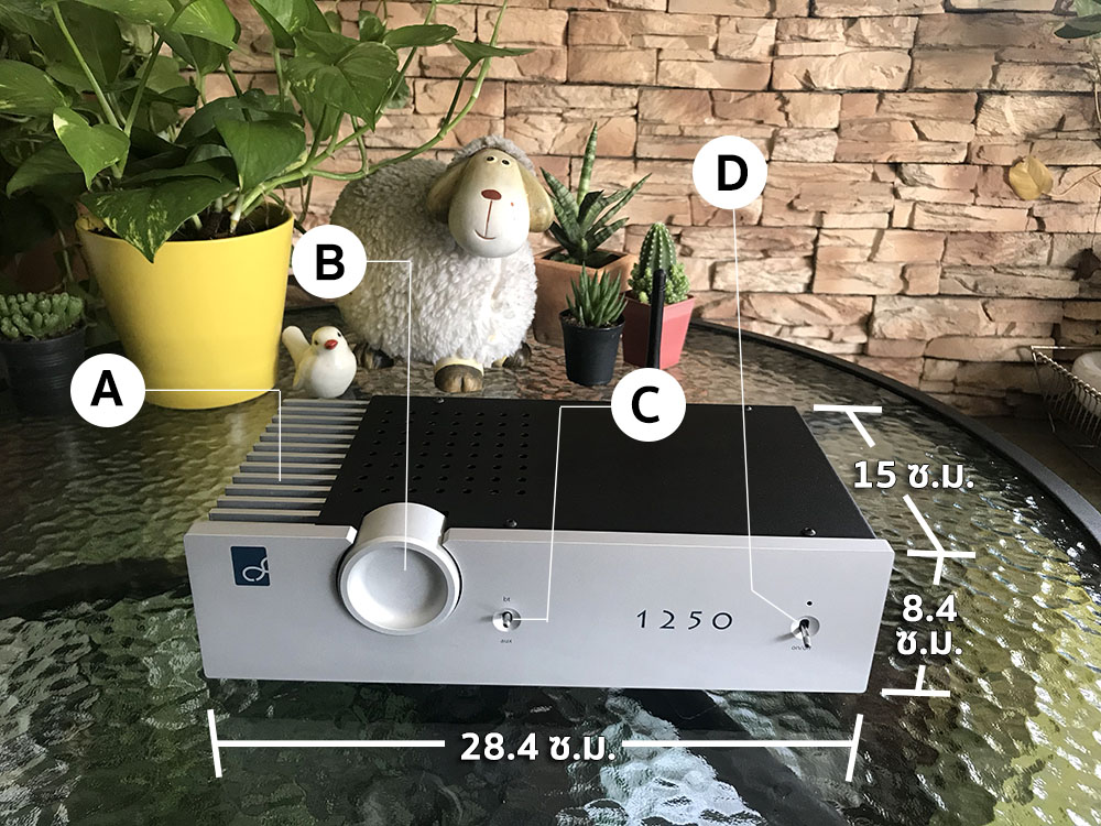 อินติเกรตแอมป์ของ Clef Audio ตัวนี้มีสัดส่วนรูปทรงอยู่ในพิกัดเล็กกระทัดรัด หน้ากว้างแค่ยี่สิบแปดเซ็นติเมตรกว่าๆ (ประมาณ 11 นิ้วนิดๆ) สูงไม่ถึงสิบเซ็นต์ฯ และลึกแค่สิบห้าเซ็นต์ฯ เท่านั้น ตัวจริงดูน่ารักดี เนื้องานก็ทำออกมาได้เรียบร้อย ดีไซน์เท่ เก๋ไก๋ ด้านข้างสองข้างไม่เหมือนกันซะด้วย ด้านหนึ่งติดตั้งฮีทซิ้งค์ (A) สำหรับระบายความร้อน ผมชอบปุ่มวอลลุ่ม (B) ที่ทำให้มีขนาดใหญ่จับเหมาะเต็มมือ ปุ่มปรับความดังได้สะดวก บนหน้าปัดเรียบง่าย นอกจากปุ่มวอลลุ่มแล้วก็มีแค่สวิทช์โยกอันเล็กๆ อีกสองอันเท่านั้น อันหนึ่งทำหน้าที่เป็นสวิทช์เลือกอินพุต (C) ซึ่งมีให้เลือกใช้อยู่ 2 อินพุตคือ Bluetooth กับ AUX (Line) กับอีกอันเป็นสวิทช์เปิด/ปิดเครื่อง (D)