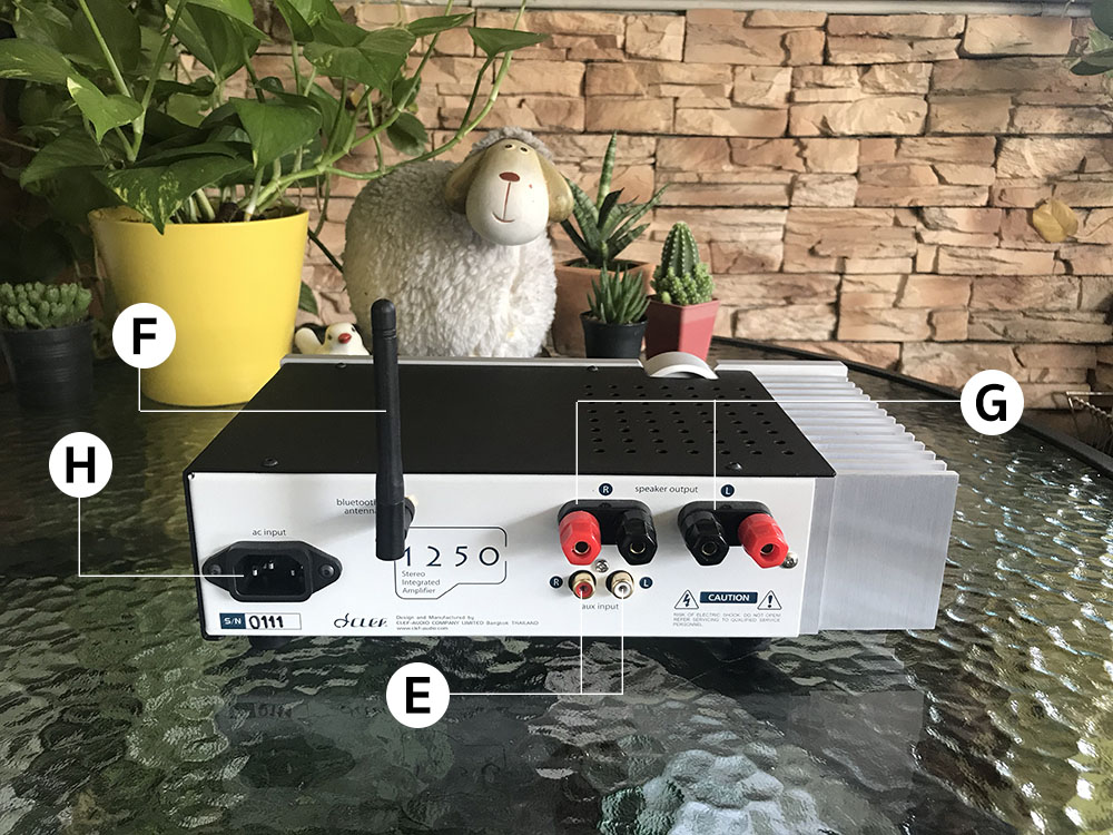 แผงด้านหลังของแอมป์ตัวน้อยตัวนี้ดูคล้ายแอมป์ตัวใหญ่ มีอินพุต AUX มาให้หนึ่งชุด (E) ติดขั้วต่อ RCA สำหรับรองรับสัญญาณเสียงจากเครื่องเล่นทุกชนิดที่อยู่ภายนอก อย่างเช่น เครื่องเล่นซีดี, ภาคขยายหัวเข็มของเครื่องเล่นแผ่นเสียง หรือเครื่องเล่นไฟล์เพลงที่เรียกว่าสตรีมเมอร์ก็นำมาต่อใช้งานร่วมกับแอมป์ตัวนี้ได้ ขั้วต่อ RCA ที่ให้มาสามารถใช้งานร่วมกับเครื่องเสียงมาตรฐานได้ทันที ไม่ต้องผ่านอะแด๊ปเตอร์ใดๆ อีกเลย ส่วนอีกอินพุตคือ Bluetooth ซึ่งใช้วิธีเชื่อมต่อกับแอมป์ตัวนี้ผ่านทางคลื่นไร้สาย ที่ตัว 1250 จึงให้เสาอากาศสำหรับรับคลื่น Bluetooth มาให้ (F) หนึ่งเสา