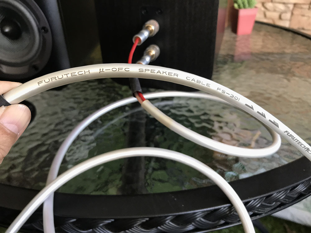 ทีแรกผมไม่ได้นึกถึงสายลำโพงที่ดีไปหว่าสายไฟเส้นใหญ่ๆ ธรรมดา เพราะคิดว่างบจะไม่พอ แต่ตอนนี้งบเราเหลือหลายพัน ผมเลยทดลองใช้สายลำโพงถูกๆ เมตรละไม่กี่สิบบาทเชื่อมต่อระหว่างแอมป์ 1250 กับลำโพง D301 สลับกับสายลำโพงเมตรละสามร้อยกว่าบาทยี่ห้อ Furutech รุ่น FS-301 ที่ผมใช้อ้างอิงทดสอบอุปกรณ์เครื่องเสียงระดับกลางๆ อยู่ ฟังเทียบกันแล้วพบว่า สายลำโพงของ Furutech รุ่น FS-301 ช่วยให้เสียงของชุดนี้ดีขึ้นมาก เสียงสะอาด เปิด พลิ้วและละเอียดน่าฟังมากขึ้น