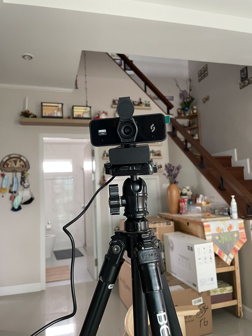 ข้อดีของรูเกลียวที่กล้องเว็บแคมตัวนี้ให้มาคือทำให้สามารถเซ็ตอัพตำแหน่งของกล้องได้อิสระกว่าใช้กล้องกับไมค์ฯ ของตัวคอมพิวเตอร์ เมื่อติดตั้งตัวกล้องเว็บแคมตัวนี้เข้ากับขาตั้งกล้อง ผมก็สามารถเล่นมุมกล้องได้หลายมุม สาย USB ที่มากับตัวกล้องก็มีความยาวพอสมควร