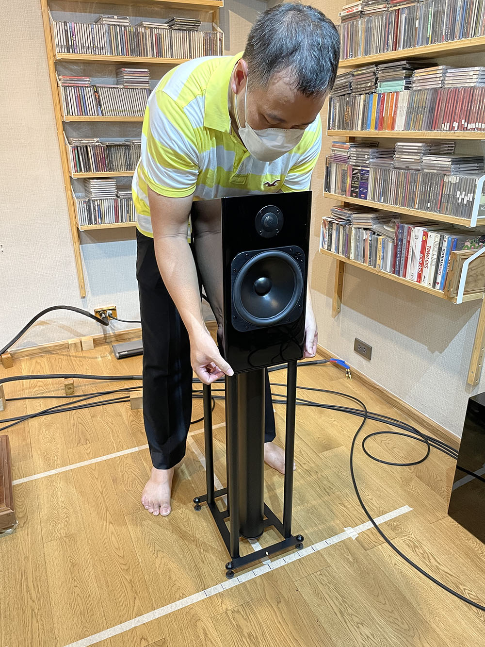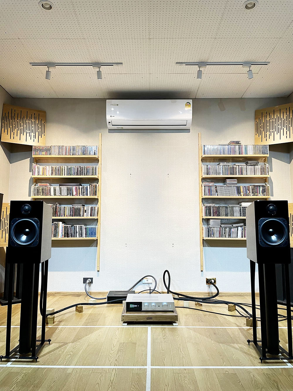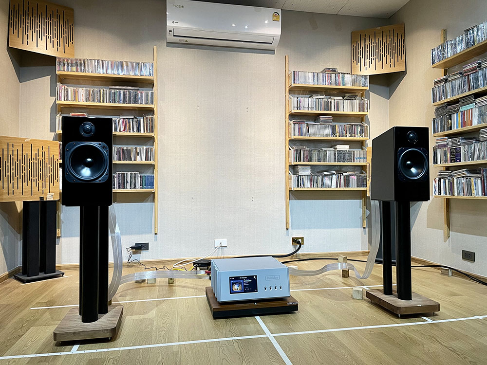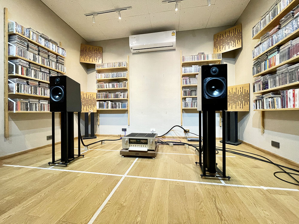 หลังจากประกอบร่างเสร็จ คุณกฤตย์ก็นำขาตั้งเข้าไปเซ็ตอัพให้ในห้องฟัง ณ จุดเริ่มต้น (ซ้าย–ขวา ห่างกัน = 180 ซ.ม.)