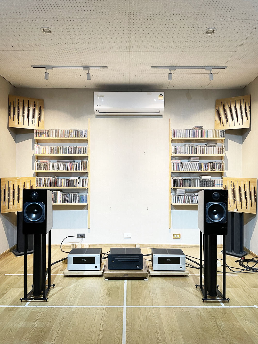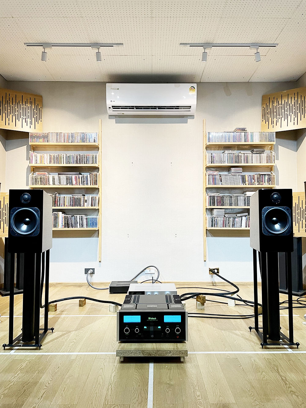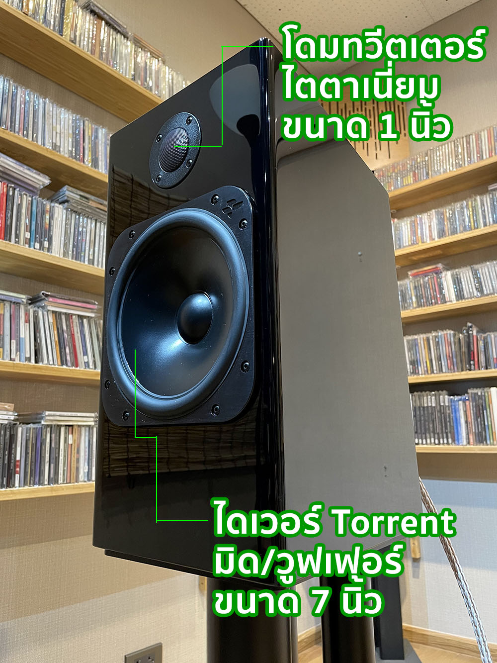 หลังจากประกอบร่างเสร็จ คุณกฤตย์ก็นำขาตั้งเข้าไปเซ็ตอัพให้ในห้องฟัง ณ จุดเริ่มต้น (ซ้าย–ขวา ห่างกัน = 180 ซ.ม.)