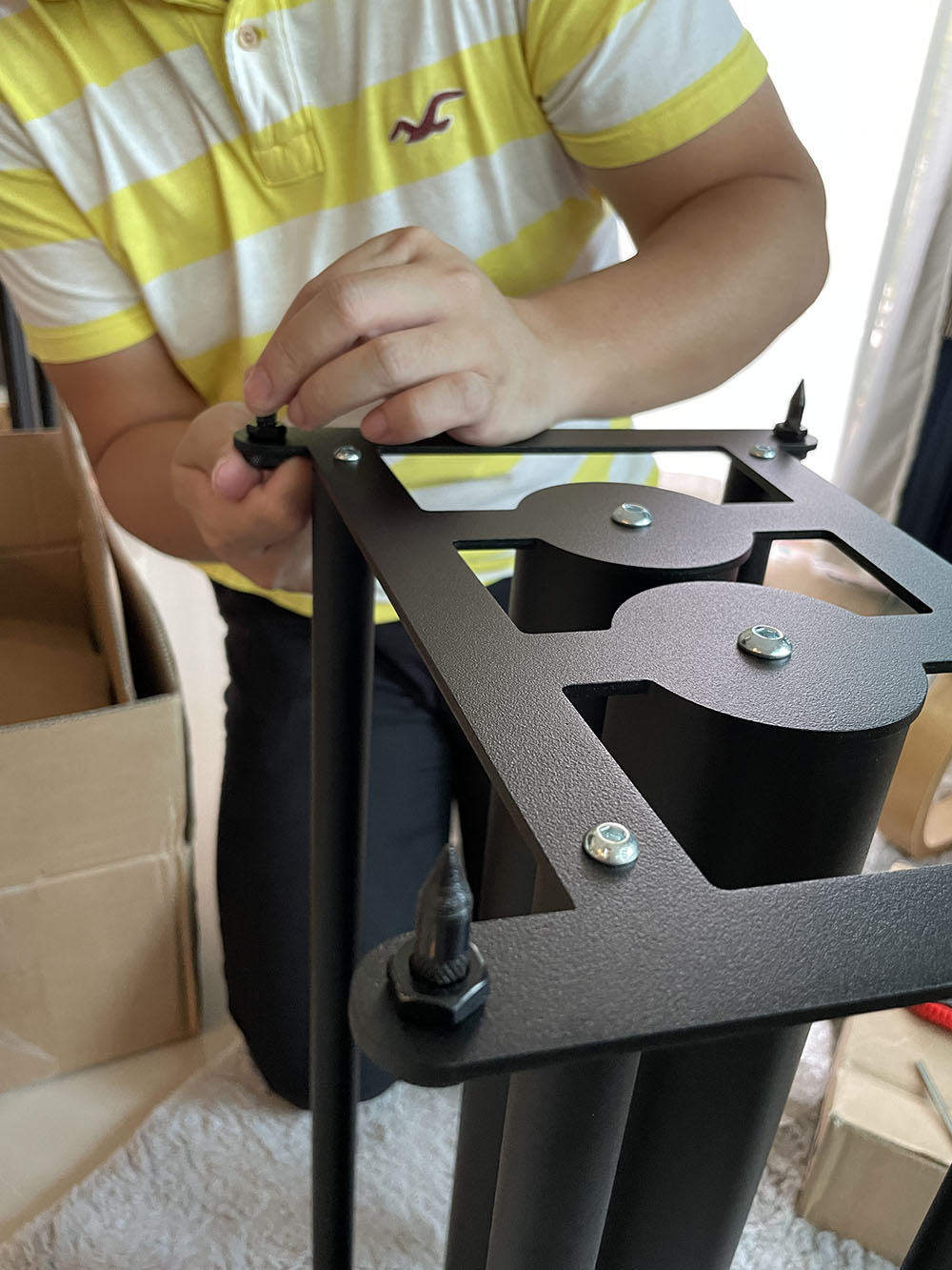 คุณกฤตย์ ผู้เชี่ยวชาญผลิตภัณฑ์ของบริษัท Deco2000 ผู้นำเข้าลำโพง Totem Acoustic ทำการประกอบขาตั้งตัวนี้ ซึ่งทางผู้ผลิตขาตั้งคือ Custom Design ใช้วิธียึดแต่ละชิ้นส่วนเข้าด้วยกันด้วยน็อตโลหะ