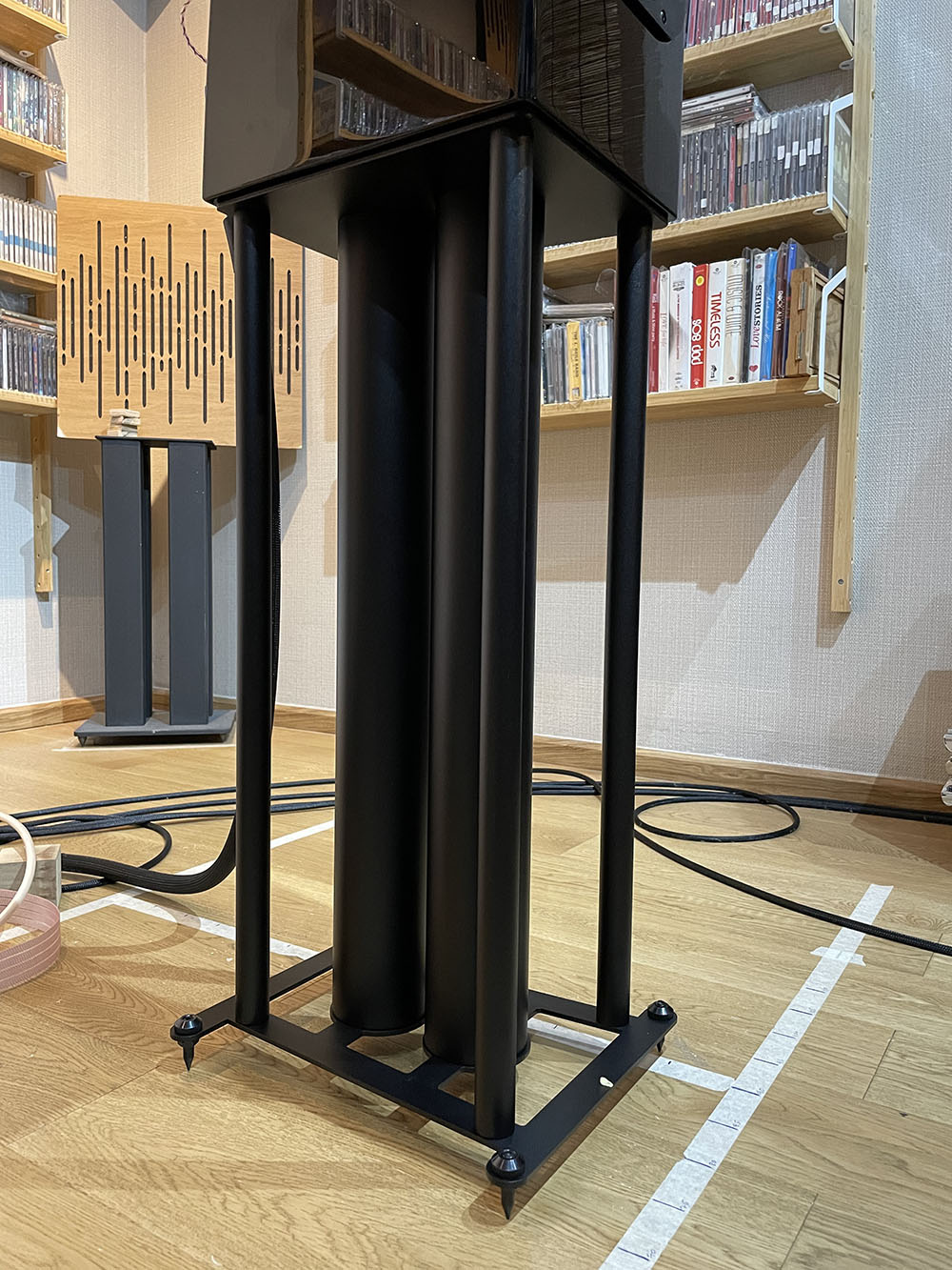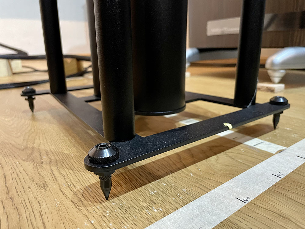ลักษณะหลังติดตั้งขาตั้งเสร็จเรียบร้อย.. ดูลงตัวมาก.! ที่มุมทั้งสี่ของแพลทล่างมีเดือยแหลมให้มาเพื่อยกขาตั้งให้ลอยจากพื้น และมีไว้ให้ใช้ในการปรับระดับลำโพงให้ตั้งฉากกับพื้น ใครที่กลัวพื้นห้องเป็นรอยเขามีจานโลหะไว้ให้รองใต้เดือยแหลมด้วย (ในภาพ ตอนไฟน์จูนจะยังไม่ได้ใช้)