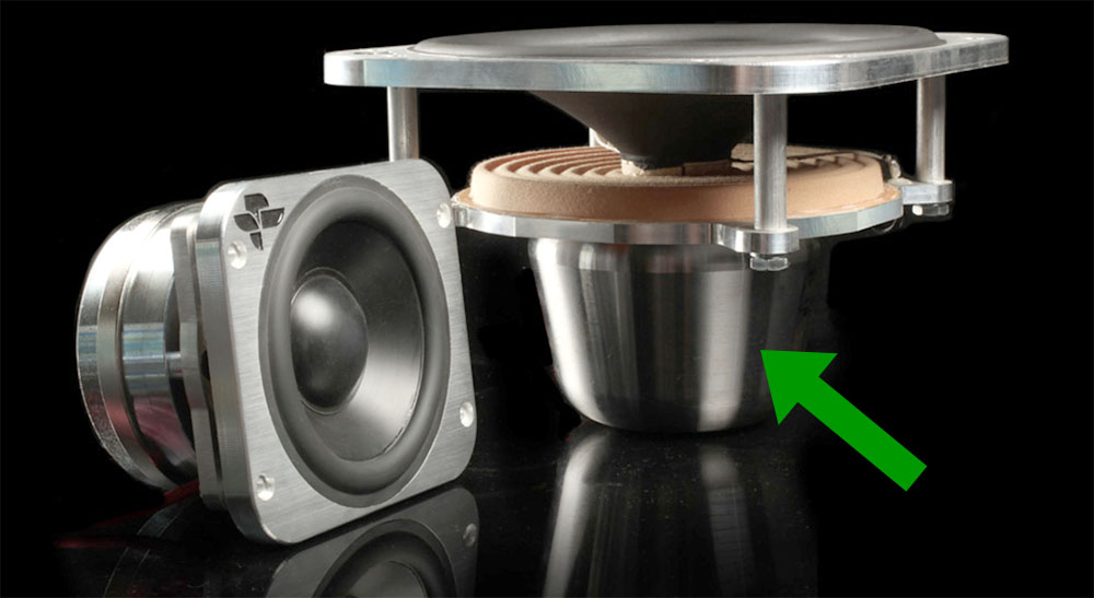 ภาพด้านบนนี้คือไดเวอร์ Torrent ขนาด 7 นิ้ว กับ 4 นิ้ว ที่ Vince Bruzzese ออกแบบและผลิตขึ้นมา ตรงตำแหน่งที่ศรชี้ในภาพข้างบนนั้นคือเฮ้าซิ่งสแตนเลสทรงกรวยที่ใช้ติดตั้งแท่งแม่เหล็กนีโอไดเมี่ยมจำนวน 17 แท่ง ที่มีความยาวแท่งละ 2.5 นิ้ว ไว้โดยรอบผนังกรวยด้านใน ล้อมรอบกระบอกวอยซ์คอยที่มีระยะช่วงชัก (เดินหน้า–ถอยหลัง) อยู่ที่ 1 นิ้ว จึงเห็นว่า ระบบแม่เหล็กของไดเวอร์ Torrent ที่คุณวินซ์ ออกแบบนี้จะแผ่พลังงานสนามแม่เหล็กครอบคลุมกระบอกวอยซ์คอยได้ทั้งหมด ไม่ว่ากระบอกวอยซ์คอยจะเดินหน้า–หรือถอยหลังในระยะชัก 1 นิ้ว เส้นตัวนำทองแดงที่พันอยู่บนกระบอกวอยซ์คอยจะได้รับพลังงานจากระบบแม่เหล็กที่เท่าเทียมกันทุกขณะที่วอยศ์คอยขยับตัว ซึ่งพลังอันมหาศาลของแม่เหล็กนีโอไดเมี่ยมทั้ง 17 ชิ้นที่ล้อมอยู่รอบๆ กระบอกวอยซ์คอยจะควบคุมการเคลื่อนตัวของวอยซ์คอยได้อย่างเต็มที่ สามารถส่งพลังดันไดอะแฟรมให้พุ่งตัวออกไปได้อย่างรวดเร็วด้วยพลังที่ตรงตามที่สัญญาณอินพุตป้อนเข้ามา กลายเป็นไดนามิกของเสียงที่ถึงพร้อมทั้งความฉับพลันและความหนักหน่วง