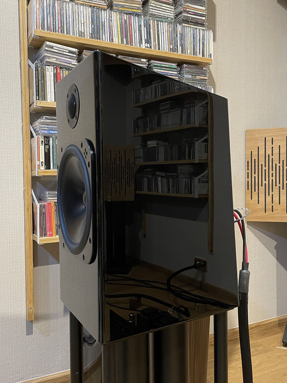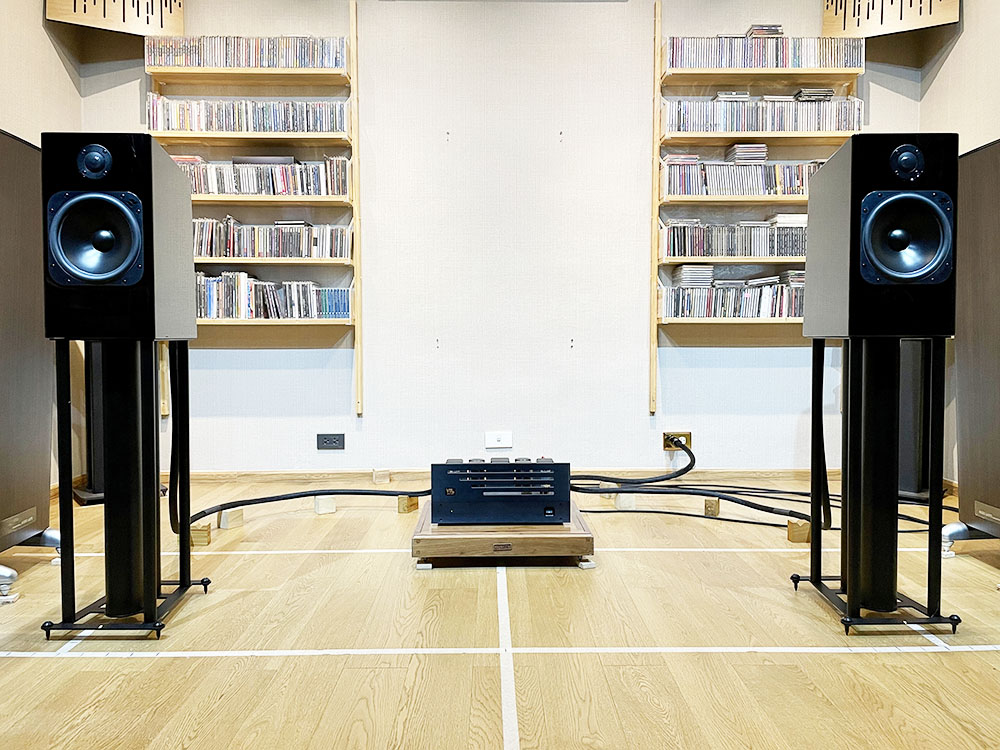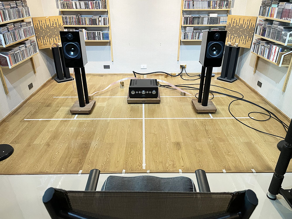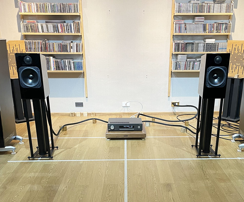 ตอนแรกที่ลำโพงมาถึง ขาตั้งตามมาทีหลัง ทำให้ช่วงประมาณ 100 ชั่งโมงแรกผมเบิร์นฯ ลำโพงคู่นี้บนขาตั้งไฮบริดจ์ไม้ผสมโลหะสูง 24 นิ้วของ Atacama รุ่น XL600 (REVIEW) ซึ่งเสียงที่ออกมาก็อยู่ในเกณฑ์ที่ดีมากน่าพอใจแล้ว ในภาพกำลังทดลองจับคู่กับอินติเกรตแอมป์ class A ของ Sugden รุ่น I-4 (REVIEW) เสียงออกมาดีมาก นุ่มนวลและไม่ยวบยาบ