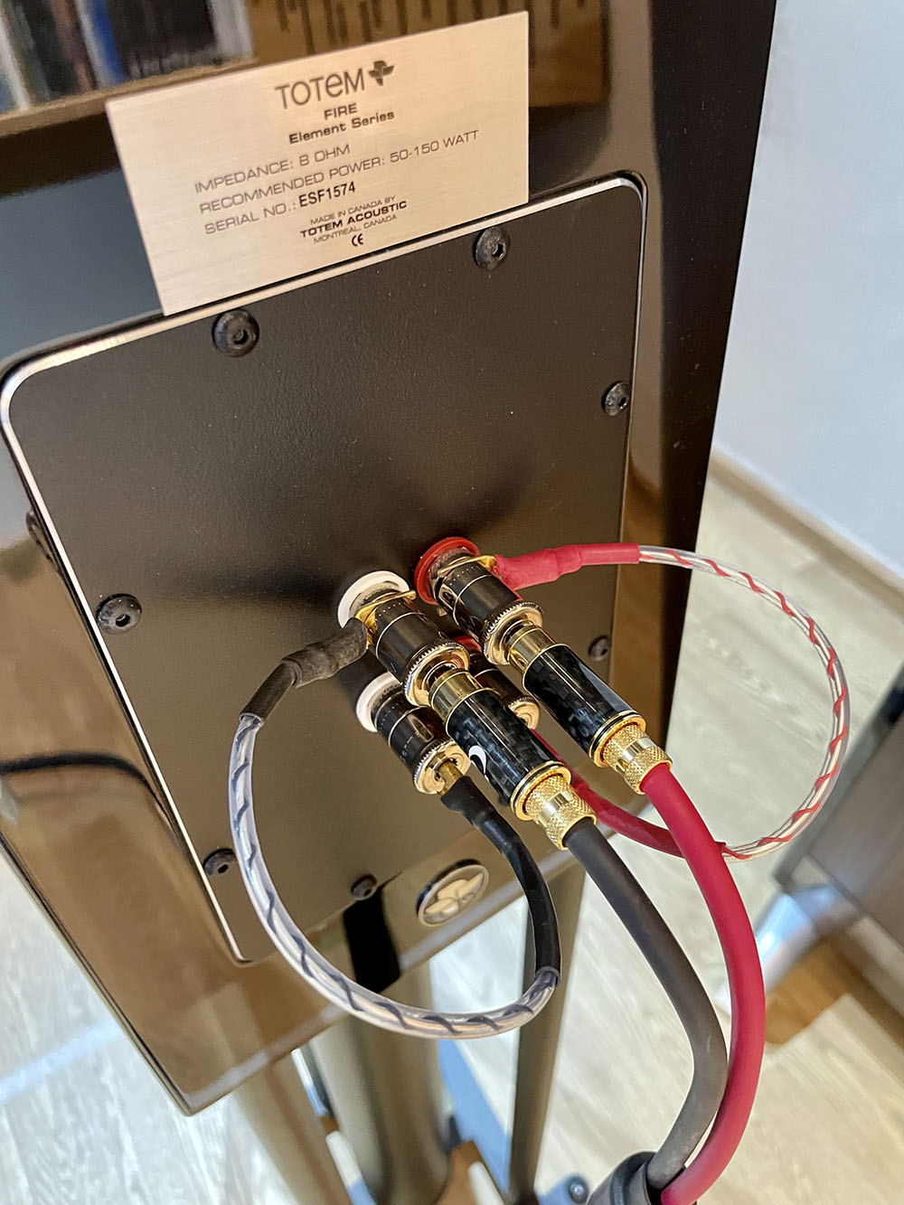 ตัวขั้วต่อสายลำโพงในรุ่น Element ‘FIRE’ v2 ตัวนี้ก็เป็นขั้วต่อแพลทตินั่ม ซึ่งเป็นรุ่นสูงของ WBT ติดตั้งมาให้ 2 ชุดต่อข้าง เปิดโอกาสให้ผู้ใช้สามารถเลือกลักษณะการเชื่อมต่อกับเพาเวอร์แอมป์ได้หลากหลายรูปแบบ ถ้าใช้สายลำโพงแบบซิงเกิ้ล ทางผู้ผลิตก็มีจั๊มเปอร์ที่เป็นแท่งโลหะมาให้ หรือคุณจะหาจั๊มเปอร์ของแบรนด์อื่นๆ มาใช้ก็ได้ (ในภาพผมใช้จั๊มเปอร์ของ Nordost รุ่น Valhalla) หรือกรณีที่คุณมีสายลำโพงไบ–ไวร์ฯ แบบ 2-to-4 ก็สามารถเสียบใช้งานกับขั้วต่อของ Element ‘FIRE’ v2 ได้โดยถอดเอาจั๊มเปอร์ออก หรือถ้าจะเอากันให้สุดไปเลย ตามอุดมคติของลำโพงที่ให้ขั้วต่อสายเบิ้ลมาสองชุดลักษณะนี้ นั่นคือใช้เพาเวอร์แอมป์ 4 แชนเนล (สเตริโอ 2 ตัว หรือ โมโนบล็อก 4 ตัว) แยกกันขับลำโพงข้างละ 2 แชนเนล ตามแบบฉบับที่เรียกว่า bi-amp ก็สามารถทำได้