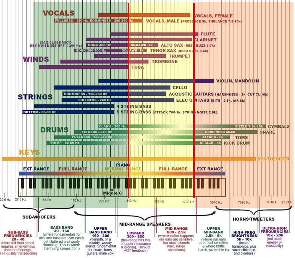 แต่ทั้งนี้ทั้งนั้น การออกแบบลำโพง 3 ทางให้ออกมาดี ทำได้ยากกว่า เพราะการที่ต้องมี “จุดตัดความถี่” (crossover frequency) ถึง 2 จุด เพื่อตัดแบ่งความถี่ตลอดย่านเสียงให้กับไดเวอร์ทั้งสามตัว จากภาพด้านบน เส้นสีแดงในแนวดิ่ง 2 เส้นในภาพคือความถี่ตรงจุดตัดทั้ง 2 จุดบนวงจรเน็ทเวิร์คของลำโพงคู่นี้ ส่วนแถบสีส้มทางขวามือคือย่านความถี่ที่ตัดแบ่งให้ทวีตเตอร์รับหน้าที่สร้างความถี่เหล่านี้ออกมา, แถบสีเหลืองคือย่านความถี่ที่กำหนดให้มิดเร้นจ์รับหน้าที่ไป และแถบสีเขียวทางซ้ายมือสุดเป็นย่านความถี่ที่กำหนดให้วูฟเฟอร์รับหน้าที่ไป