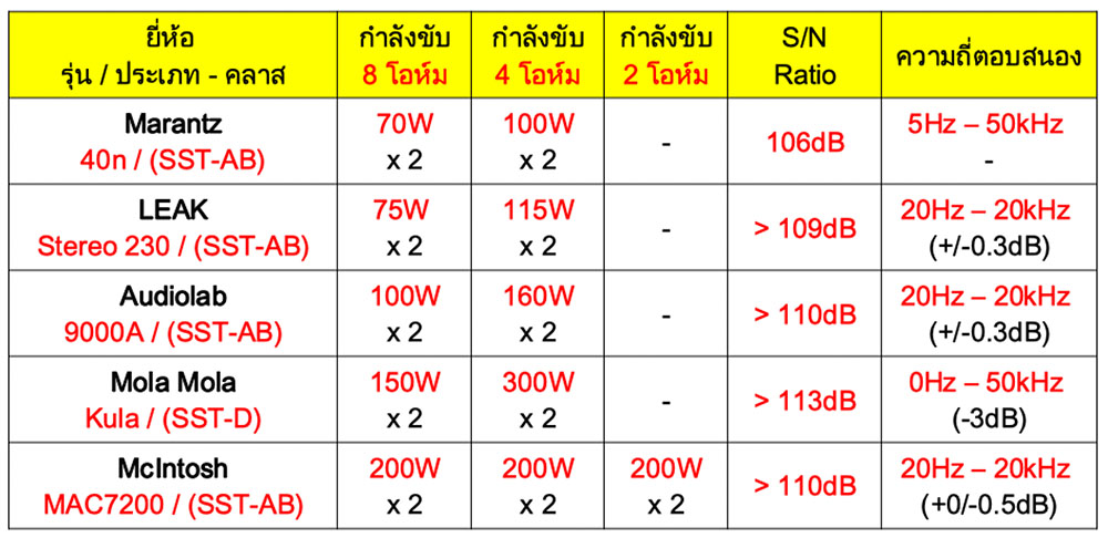 ขณะทดสอบ UA-50 ในห้องฟังของผมมีอินติเกรตแอมป์ที่พร้อมให้ทดลองแม็ทชิ่งกับ UA-50 ทั้งหมด 5 ตัว ซึ่งทั้งหมดนั้นมีกำลังขับอยู่ระหว่าง 70W ขึ้นไปจนถึงสูงสุดที่ 200W ต่อข้างที่โหลด 8 โอห์ม (ดูตารางข้างบน)