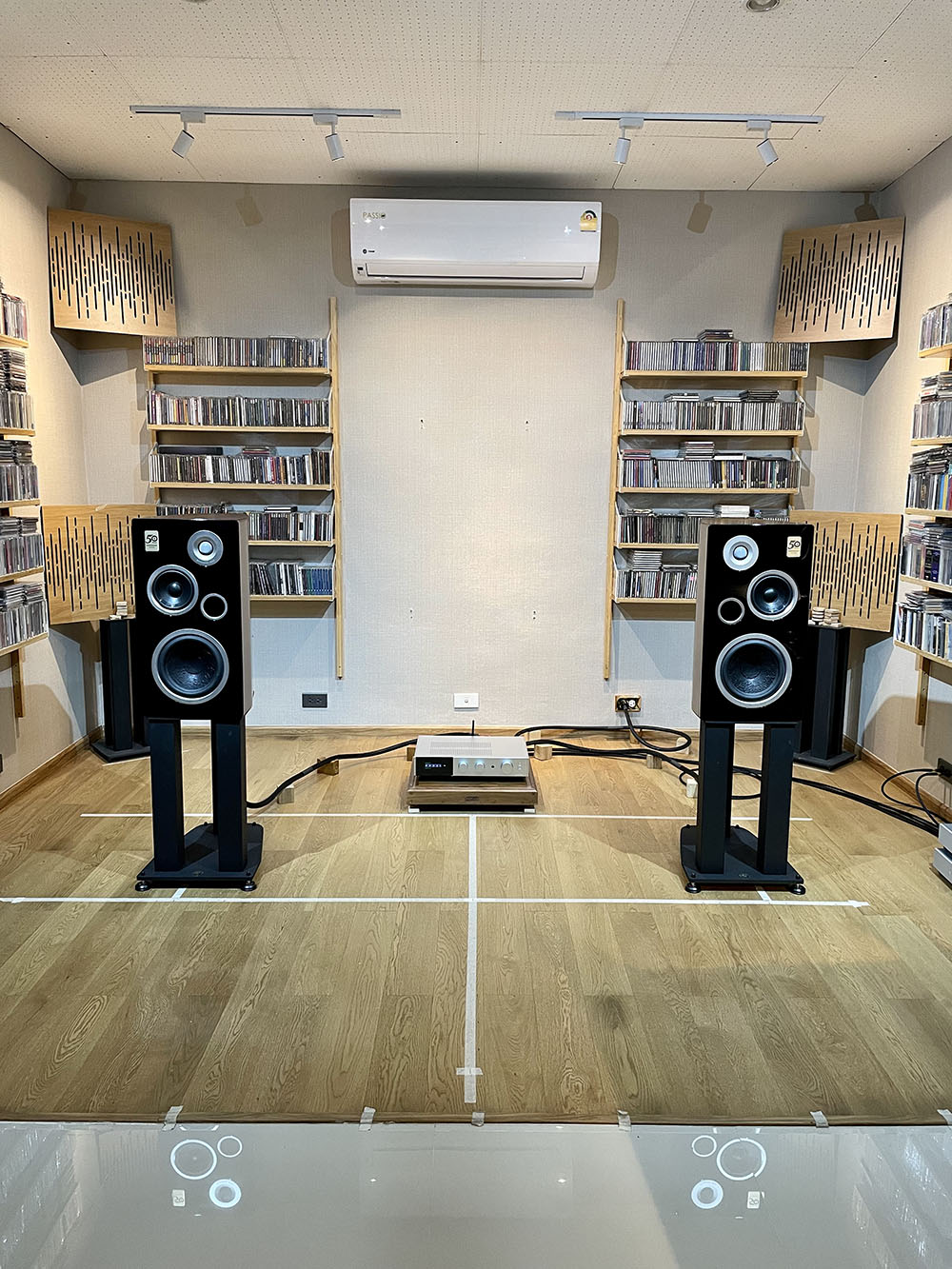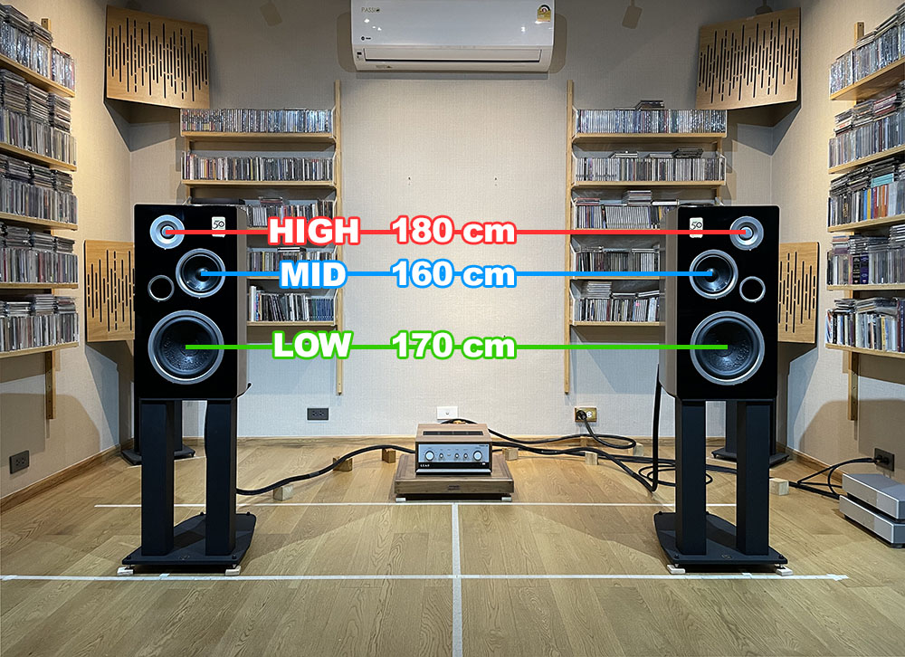 ผมลองเซ็ตอัพทั้งสองลักษณะแล้ว โดยเริ่มต้นที่ระยะห่างซ้าย–ขวา = 180 ซ.ม. และห่างหลังอยู่ที่ 220 ซ.ม. (ความลึก 6.6 เมตร หารด้วยสาม) หลังจากขยับและฟังเสียงมาเรื่อยๆ จะได้ระยะวางที่ผมพอใจโฟกัสของเสียงมากที่สุดอยู่ที่ระดับห่างซ้าย–ขวา = 170 ซ.ม. และระยะห่างหลังที่ให้โทนัลบาลานซ์ที่ผมพอใจมากที่สุดอยู่ที่ระยะ = 210 ซ.ม. ซึ่งระยะลงตัว (โฟกัส + โทนัลบาลานซ์) ของการวางลำโพงทั้งสองรูปแบบนี้อยู่ในจุดที่ใกล้เคียงกันมาก แทบจะเป็นตำแหน่งเดียวกัน.! แต่เสียงออกมาต่างกันไปคนละแบบ.!!