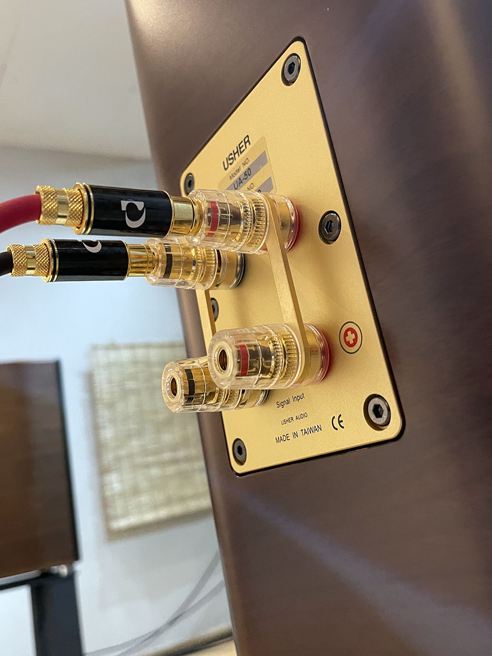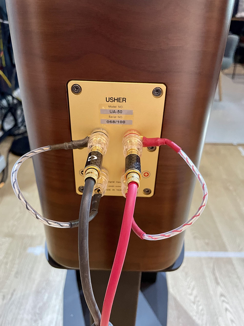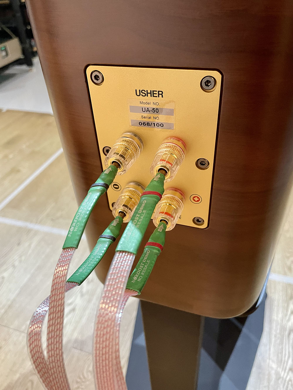 อีกวิธีของการเชื่อมต่อคือหาสายจั๊มเปอร์มาใช้แทนแท่งโลหะที่ผู้ผลิตแถมมา ซึ่งโดยมากแล้ว สายจั๊มเปอร์ที่ผู้ผลิตสายลำโพงทำออกมาขายมักจะให้เสียงโดยรวมออกมา “ดีกว่า” แท่งโลหะจั๊มเปอร์ที่แถมมา มากบ้าง–น้อยบ้าง ก็แล้วแต่แบรนด์, รุ่น และราคา ของจั๊มเปอร์นั้นๆ ในภาพผมทดลองใช้จั๊มเปอร์ของ Nordost รุ่น Norse 2 เสียงออกมาดีกว่าแท่งโลหะที่แถมมาเยอะมาก.! ถ้าใครใช้สายลำโพงแบบซิงเกิ้ล 2 > 2 ที่มีราคาสูงๆ คุณภาพดีมากๆ อยู่แล้วก็ควรจะหาจั๊มเปอร์ดีๆ มาใช้ อย่างของ Nordost ที่ผมเลือกใช้เพราะมันให้สปีดของการตอบสนองที่ฉับไว ไปกันได้ดีกับการทำงานของทวีตเตอร์โลหะลักษณะนี้ โดยเฉพาะกับลำโพง Usher Audio คู่นี้ซึ่งใช้ทวีตเตอร์ไดม่อน คอมโพสิต ที่เปิดความถี่ด้านแหลมไปได้สูงมากถึง 40kHz เปลี่ยนจั๊มเปอร์ดีๆ เข้าไปจึงเห็นผลมากเป็นพิเศษโดยเฉพาะในย่านกลาง–แหลม