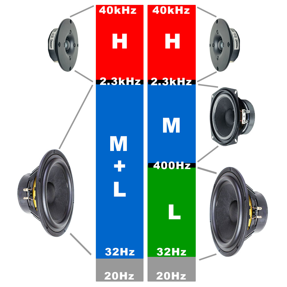 ชาร์ตข้างบนนั้นทำขึ้นมาเพื่อใช้ประกอบการอธิบายให้เห็นภาพชัดขึ้นถึง “ข้อดี” ที่ได้จากลำโพงสามทาง เปรียบเทียบกับลำโพงสองทางโดยทั่วไป ซึ่งโดยปกติแล้ว ไม่ว่าจะเป็นลำโพง 2 ทาง หรือ 3 ทาง ตัวทวีตเตอร์มักจะถูกกำหนดจุดตัดอยู่ระหว่าง 2.0kHz – 2.5kHz ซึ่งถ้าเป็นลำโพง 2 ทาง ความถี่ต่ำที่เหลือก็จะถูกโยนไปที่ตัวมิด/วูฟเฟอร์ทั้งหมด ในขณะที่ลำโพง 3 ทางจะมีไดเวอร์สองตัวคือมิดเร้นจ์กับวูฟเฟอร์เข้ามาช่วยกันแบ่งเบาภาระ