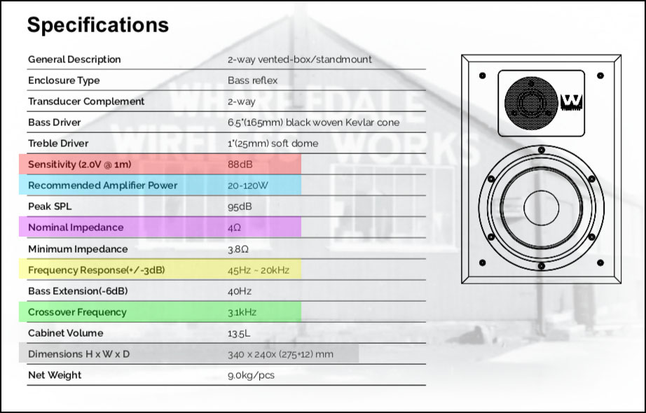 รูปบนเป็นสเปคฯ ของเวอร์ชั่น 80th ส่วนรูปล่างเป็นสเปคฯ ของเวอร์ชั่น 85th จะเห็นจุดแตกต่างสำคัญๆ อยู่หลายจุดซึ่งน่าจะพูดได้ว่า แทบจะเป็นดีไซน์คนละรูปแบบกันเลย เริ่มจาก frequency response หรือ “ความถี่ตอบสนอง” ก่อนเลย (แถบเหลือง) ซึ่งในเวอร์ชั่น 85th ถูกลดแบนด์วิธด้านบนของสเปคตรัมลงมานิดหน่อย คือจาก 24kHz ลงมาอยู่ที่ 20kHz ส่วนทางด้านทุ้มยังคงใกล้เคียงกัน ทว่า ในเวอร์ชั่น 85th มีให้ข้อมูลว่าได้จัดให้ความถี่ต่ำขยายผ่านท่อระบายลงไปได้ต่ำกว่าหน้าตู้อีกประมาณ 5Hz จาก 45Hz ลงไปที่ 40Hz ด้วยอัตราลาดชันของความดังอยู่ที่ -6dB ค่อนข้างชัน เก็บรวบหางเร็ว