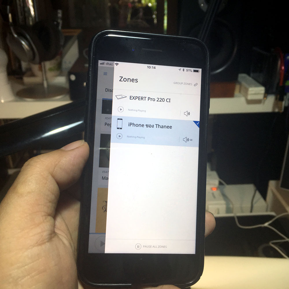 จะปรากฏโซนขึ้นมาให้เลือก ซึ่งในขณะนั้น ผมเชื่อมต่ออินติเกรตแอมป์ Devialet EXPERT Pro 220 อยู่ในระบบ แต่เราต้องการให้เสียงเพลงมาดังที่ iPhone 7 ให้ใช้ปลายนิ้วจิ้มกดไปที่ iPhone (ในภาพคือ iPhone ของ Thanee)