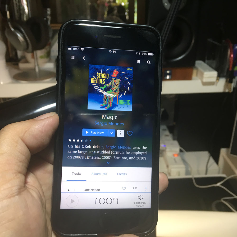 นี่คือหน้าจอตอนเพลย์แบ็คของแอพฯ roon remote ซึ่งมีรายละเอียดขึ้นมาแสดงเหมืนอกับตอนที่ควบคุมผ่านหน้าโปรแกรมบนคอมพิวเตอร์ทุกประการ ต่างกันที่การจัดหน้าเท่านั้น
