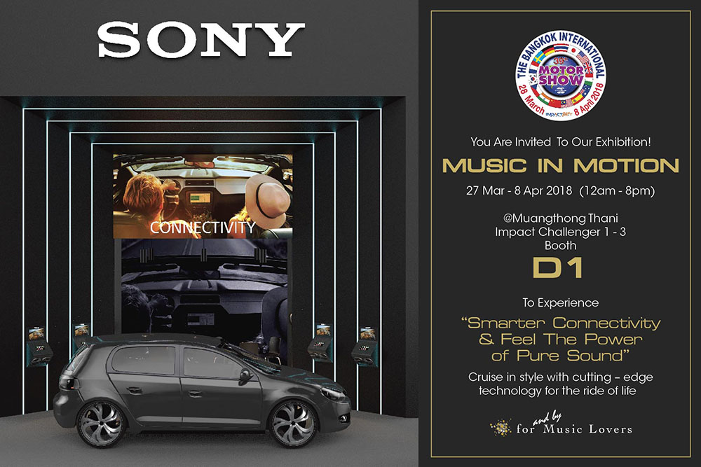 โซนี่ ไทย พร้อมจัดเต็มขบวนไลน์อัพชุดเครื่องเสียงรถยนต์ สร้างมิติใหม่พลังเสียงตอบโจทย์การใช้งานทุกไลฟ์สไตล์ที่งาน Bangkok International Motor Show 2018 ณ อาคารชาเลนเจอร์ 1 อิมแพ็ค เมืองทองธานี ระหว่างวันที่ 28 มีนาคม ถึง 8 เมษายน ศกนี้