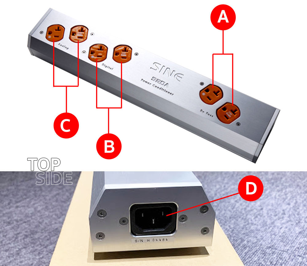 A = ช่องบายพาส ไม่ผ่านวงจรฟิลเตอร์ สำหรับอุปกรณ์เครื่องเสียงที่บริโภคไฟเกิน 600 วัตต์