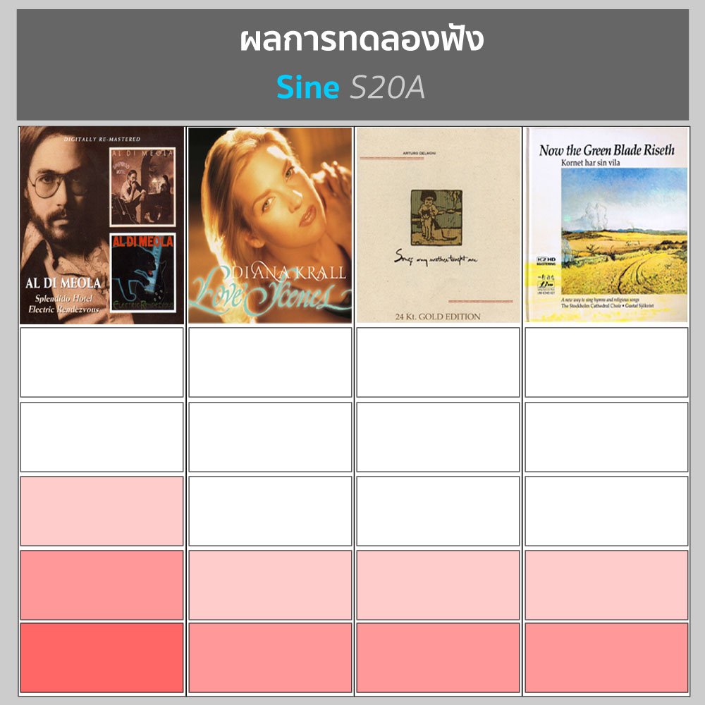ใครที่ไม่เคยเชื่อว่า อุปกรณ์เสริมอย่างพวกเพาเวอร์ คอนดิชั่นเนอร์จะทำให้เสียงของซิสเต็มเปลี่ยนไปได้ ขอให้ไปทดลองฟัง S20A ตัวนี้ดูก็แล้วกัน หลังจากย้ายสายเอซีของอุปกรณ์เครื่องเสียงทั้งเซ็ตที่เสียบอยู่บนปลั๊กรางราคาอันละสามร้อยกว่าบาท มาเสียบลงบน S20A ตัวนี้แล้วเปิดเพลงเดิมๆ ฟัง เสียงที่ได้ยินมันเปลี่ยนไปเยอะมาก! อย่างแรกที่สัมผัสได้คือความคึกคัก กระฉับกระเฉง รู้สึกได้ว่าเสียงที่ได้ยินมีพลังมากขึ้น คล้ายเปลี่ยนแอมป์ที่ใหญ่ขึ้น อิมเมจของชิ้นดนตรีมีความชัดเจนมากขึ้น เข้มขึ้น แต่ส่วนที่ลดน้อยลงคือหางเสียงที่เป็นความกังวานของฮาร์มอนิกจะมีลักษณะที่ลาดชันมากขึ้น คือระยะเวลาของปรากฏการณ์ เกิดขึ้น–คงอยู่–ดับไป ของแต่ละเสียงหดสั้นลงกว่าตอนเสียบผ่านปลั๊กรางธรรมดานิดหน่อย ซึ่งอาการนี้ส่งผลมากในย่านทุ้ม คือทำให้เสียงทุ้มมีลักษณะที่กระชับมากขึ้น ตึงตัวมากขึ้น หัวเสียงเร็ว เก็บตัว และขมวดรวบหางเสียงไว ใครที่ใช้ลำโพงขนาดใหญ่ที่รู้สึกว่าเบสหลวมๆ ไม่เก็บตัว หัวเสียงเบสไม่คม หางเสียงอื้ออึง ใช้เพาเวอร์ คอนดิชั่นเนอร์ตัวนี้แล้วจะได้เสียงที่เร็วกระชับมากขึ้น แต่คนที่ใช้ลำโพงเล็กๆ อาจจะรู้สึกว่าเบสน้อยลง และอาจจะรู้สึกว่าเสียงมีลักษณะพุ่งและเค้นนิดๆ เมื่อฟังเทียบกับตัวใหญ่กว่าอย่าง PowerWave และ Denali 6000/s V2 ซึ่งให้เสียงที่ผ่อนคลายมากกว่า