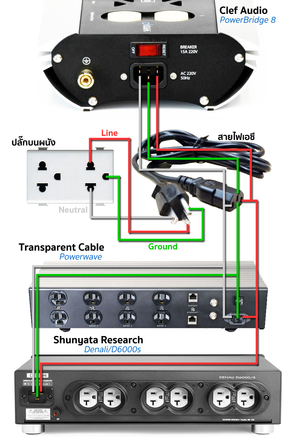 ลักษณะการต่อเชื่อมตัว Power Conditioner แต่ละตัวเข้ากับปลั๊กบนผนัง (ที่มีระบบกราวนด์ และผ่านการตรวจเช็คเฟสถูกต้อง) ซึ่งผมจะใช้สายไฟธรรมดาที่แถมมากับเครื่องทั้งสี่ตัว ของ PowerBRIDGE-8, S20A และ PowerWave เป็นสายไฟ 15Amp ส่วนของ Denali 6000/s V2 เป็นสายไฟที่ใช้หัวปลั๊กแบบ 20Amp แต่ตัวสายก็เป็นสายแถมเช่นกัน