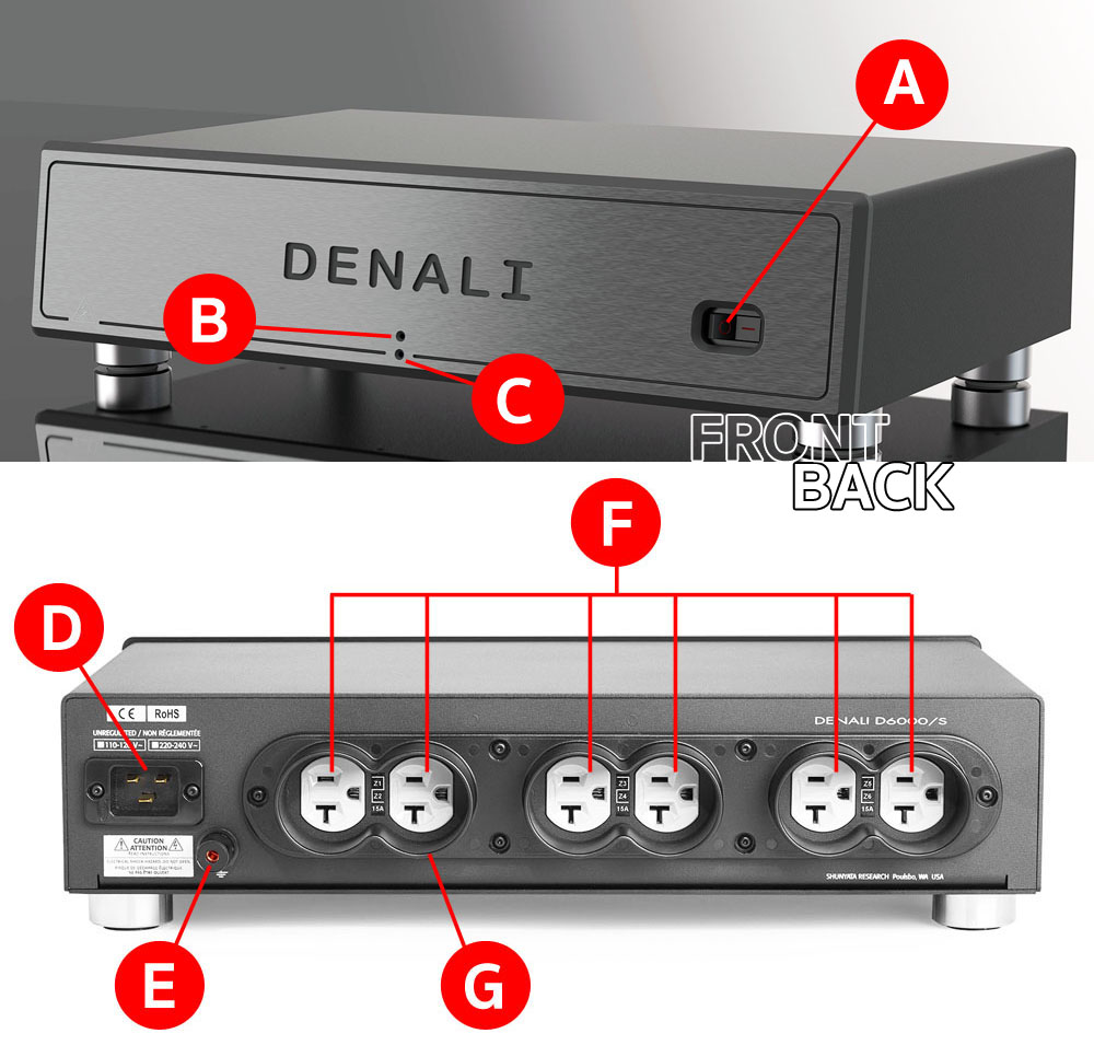 F = เต้ารับสำหรับจ่ายไฟให้เครื่องเสียงจำนวน 6 ช่อง