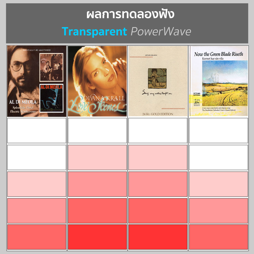 ตัวกรองไฟของ Transparent ตัวนี้ให้คุณภาพเสียงโดยรวมสูงกว่า PowerBRIDGE-8 และ S20A มาก เป็นตัวที่ให้เสียงกลางที่โดดเด่น เผอิญผมเริ่มต้นด้วยการลองฟังเพลงร้องก่อน หลังจากทดลองเสียบอุปกรณ์ในซิสเต็มทั้งหมดผ่านปลั๊กรางราคาถูกฟังแล้ว สลับมาเสียบผ่าน PowerWave ตัวนี้จะเห็นได้ชัดว่าเสียงร้องของ Diana Krall มีความน่าฟังขึ้นมาก ตัวเสียงมีลักษณะที่ลอยเด่นเหนือเครื่องดนตรีชิ้นอื่นขึ้นมามากขึ้น เนื้อนวลและเนียนมากขึ้น แทบจะไม่พบอาการหยาบกร้านเลย ในแง่ดุลเสียง ผมพบว่า PowerWave ตัวนี้เน้นไปที่แบนด์วิธที่เปิดกว้าง ไปทางเดียวกับ Denali 6000/s V2 แต่เป็นรองในแง่ของน้ำหนักของเสียงในการย้ำเน้นไดนามิกที่หนา หนัก และแน่น แต่ในแง่ความอ่อนช้อยในการเอื้อนและควบคุมคอนทราสน์ ไดนามิกของคำร้องทำได้ไม่แพ้ Denali 6000/s V2 มากนัก ข้ออ่อนด้อยกว่า Denali 6000/s V2 ที่ค่อนข้างชัดเจนก็อยู่ที่ความแน่นหนาของมวลเนื้อเมื่อความถี่ลาดต่ำลงไปถึงทุ้ม ซึ่งในย่านต่ำๆ PowerWave จะให้เสียงออกมาในลักษณะที่ไม่ได้เน้นหัวเสียงหนักๆ แต่เน้นไปทางทอดตัวยาว จึงทำให้ได้ความรู้สึกที่ผ่อนคลาย ปลดปล่อย เหมาะกับเพลงแจ๊สน้อยชิ้น (แบบอัลบั้ม Love Scenes) กับเพลงแนวไล้ท์มิวสิค (แบบอัลบั้ม Songs My Mother Taught Me) จะได้อารมณ์สุดๆ เมื่อฟังเมื่อฟังอัลบั้มของ Al di Meola ความมันในอารมณ์จะเป็นรอง Denali 6000/s V2 พอสมควร ใครที่ชอบเพลงร้องและชอบโทนย่านต่ำที่อิ่มแผ่ซึ่งเป็นแนวทางของ Transparent แต่ใช้ซิสเต็มใหญ่หน่อย อยากได้ตัวที่สมรรถนะสูงกว่า PowerWave ตัวนี้ซึ่งให้น้ำหนักของเสียงมากขึ้น แนะนำให้ข้ามไปที่รุ่น Reference Powerisolator หรือจะไปสุดซอยที่รุ่น Opus Powerisolator คุณจะได้แนวเสียงไปโทนเดียวกับ PowerWave ตัวนี้ในระดับสมรรถนะที่สูงกว่านี้อีกเยอะ โดยเฉพาะในแง่ของน้ำหนักเสียง