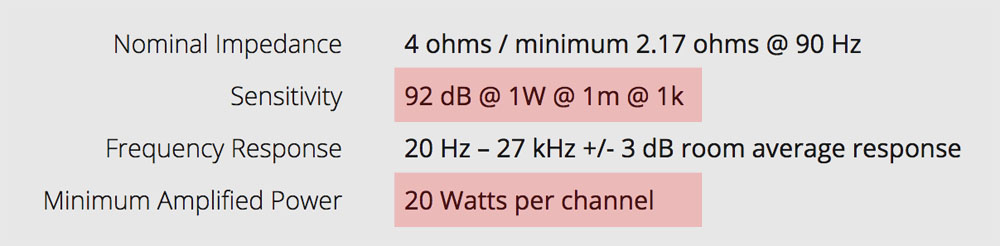 ส่วนสเปคฯ อีกตัวที่ช่วยทำให้ Wilson Audio รุ่นนี้เป็นมิตรกับแอมป์วัตต์ต่ำๆ มากเป็นพิเศษ นั่นคือ Minimum Amplified Power หรือกำลังขับต่ำสุดที่แนะนำสำหรับลำโพงรุ่นนี้อยู่ที่ 20W ต่อข้าง ซึ่งก็หมายความว่า ไม่ควรใช้แอมป์ที่มีกำลังขับ “ต่ำกว่า” 20W ต่อข้างขับลำโพงรุ่นนี้ ซึ่งนอกจากจะให้เสียงออกมาไม่ดีแล้ว อาจจะทำให้ลำโพงเสียหายได้อีกด้วย