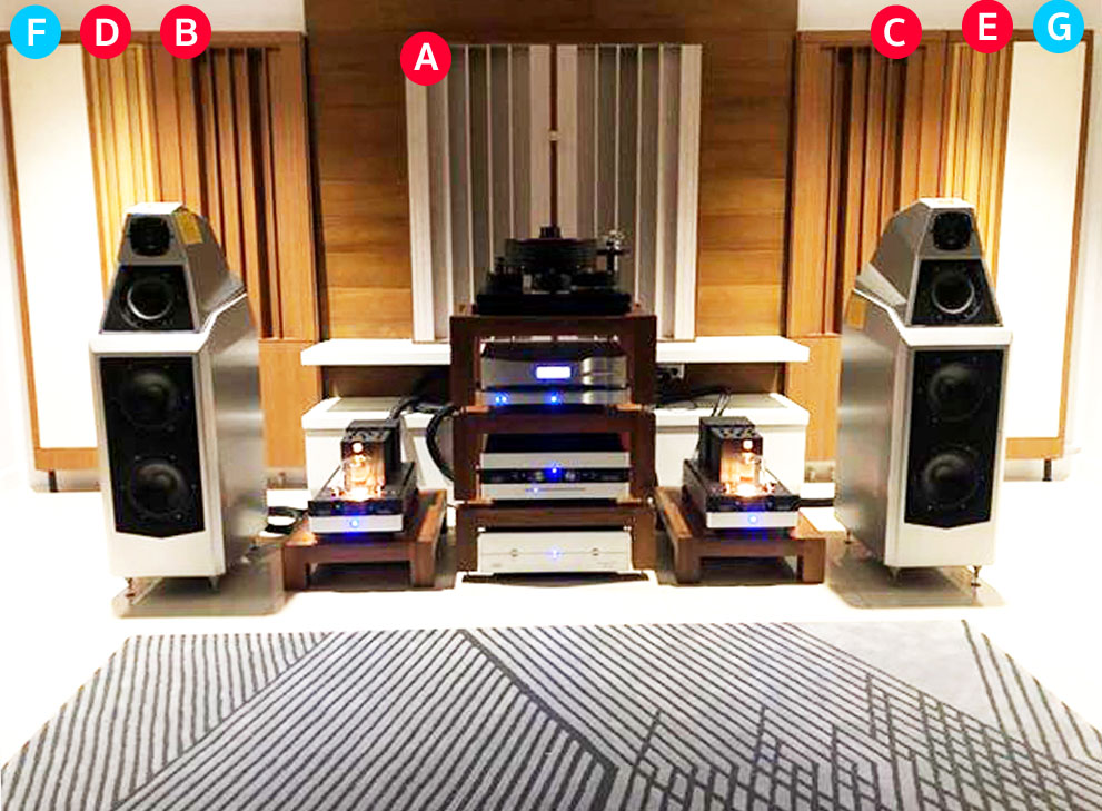 ภาพบนคือลักษณะของสภาพอะคูสติกในห้องของคุณต่อ โดยที่ตำแหน่ง A, B และ C ในภาพเป็นแผงดิวฟิวเซอร์ร่องใหญ่ ส่วนตำแหน่ง D กับ E เป็นดิฟฟิวเซอร์ร่องเล็ก ในขณะที่ตำแหน่ง F กับ G นั้นเป็นแผงซับเสียง