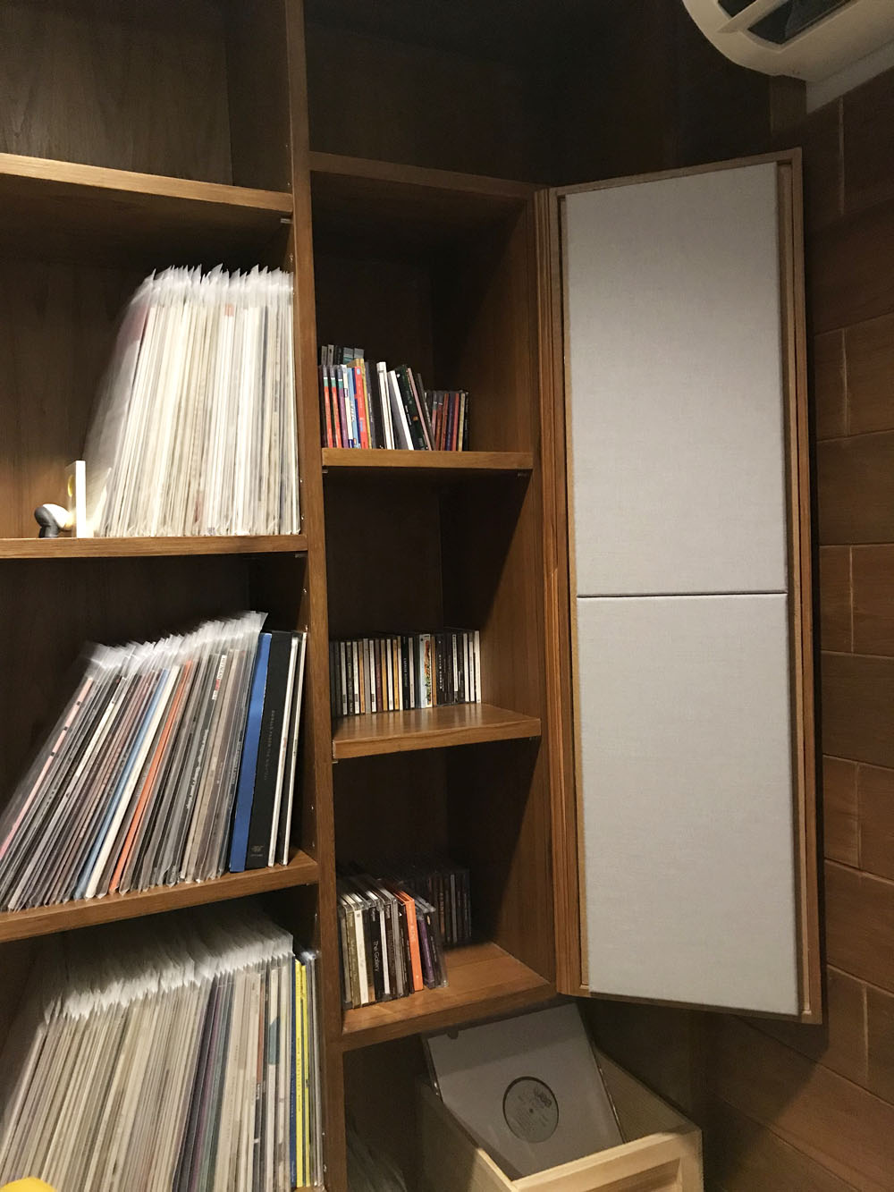 มุมนี้อยู่ทางด้านขวามือของห้อง ฝั่งที่อยู่ด้านหลังตำแหน่งนั่งฟัง ซึ่งคุณต่อดัดแปลงพื้นที่บริเวณนี้ทำเป็นช่องสี่เหลี่ยมไว้เก็บแผ่นเสียงและแผ่นซีดี ซึ่งก็มีลักษณะช่วยฟุ้งเสียง (diffuse) ไปในตัว ส่วนแผงซับเสียงที่อยู่ในภาพช่วยแก้ปัญหาเสียงทุ้ม