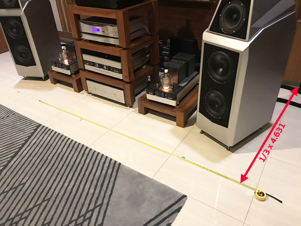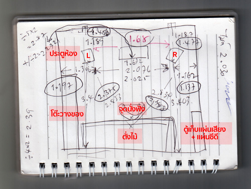 ดูจากรูปบน ณ ตำแหน่งเดิมของลำโพงนั้น ระยะหว่างระหว่างข้างซ้ายกับข้างขวาอยู่ที่ประมาณ 1.6 ม. และลำโพงข้างซ้ายอยู่ห่างจากผนังด้านหลังเท่ากับ 1.1 ม. ในขณะที่ลำโพงข้างขวาอยู่ห่างจากผนังด้านหลังเท่ากับ 1.1 ม. เท่ากัน ส่วนระยะห่างระหว่างตัวลำโพงกับผนังด้านข้างของลำโพงข้างซ้าย วัดได้ประมาณ 1.6 ม. ส่วนข้างขวากับผนังด้านข้างขวาวัดได้ประมาณ 1.4 ม.*