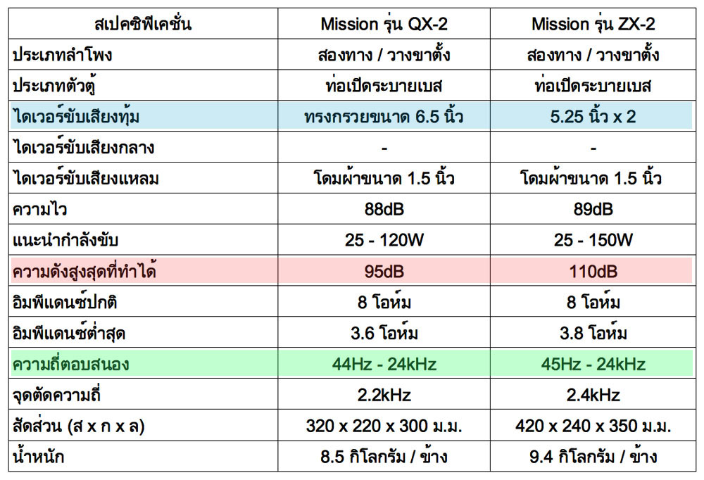 ผมใช้เวลาหาข้อมูลของลำโพงสองรุ่นนี้ทางเว็บไซต์อยู่พักหนึ่ง ได้อะไรมาไม่มากนัก ข้อมูลที่พบก็คือ ZX-2 เป็นรุ่นที่อยู่ในซีรี่ย์ “ใหญ่กว่า” รุ่น QX-2 แม้ว่าทั้ง QX-2 และ ZX-2 ต่างก็อยู่ในลำดับที่สองของแต่ละอนุกรมเหมือนกัน ทว่า อนุกรม ZX ถูกจัดอยู่ในลำดับชั้นที่สูงกว่าอนุกรม QX ซึ่งในเว็บไซต์ของ Mission เองก็แจกแจงรายละเอียดเอาไว้ชัดเจนว่าในการออกแบบนั้น รุ่น ZX-2 ใช้วัสดุและอุปกรณ์ที่มีคุณภาพสูงกว่า ด้วยเหตุนี้ ถ้าเอา ZX-2 กับ QX-2 มาฟังเทียบกัน รุ่น ZX-2 ควรจะ “ต้อง” ให้คุณภาพเสียงออกมา “ดีกว่า” รุ่น QX-2 เพราะเป็นรุ่นที่ใหญ่กว่า